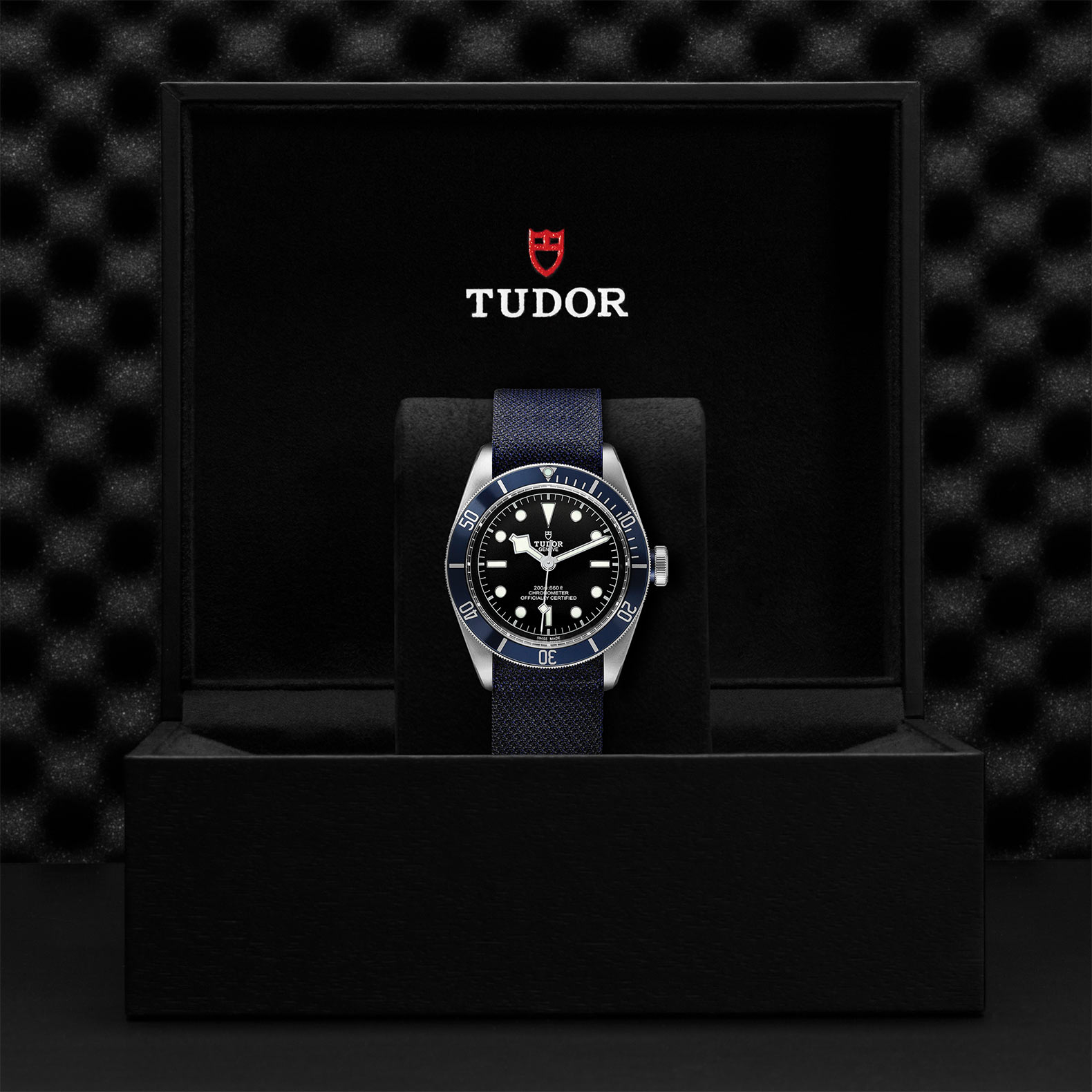 精钢旋入式上链表冠,刻有帝舵表玫瑰标志,黑色漆面,配蓝色阳极氧化铝上链表冠轴