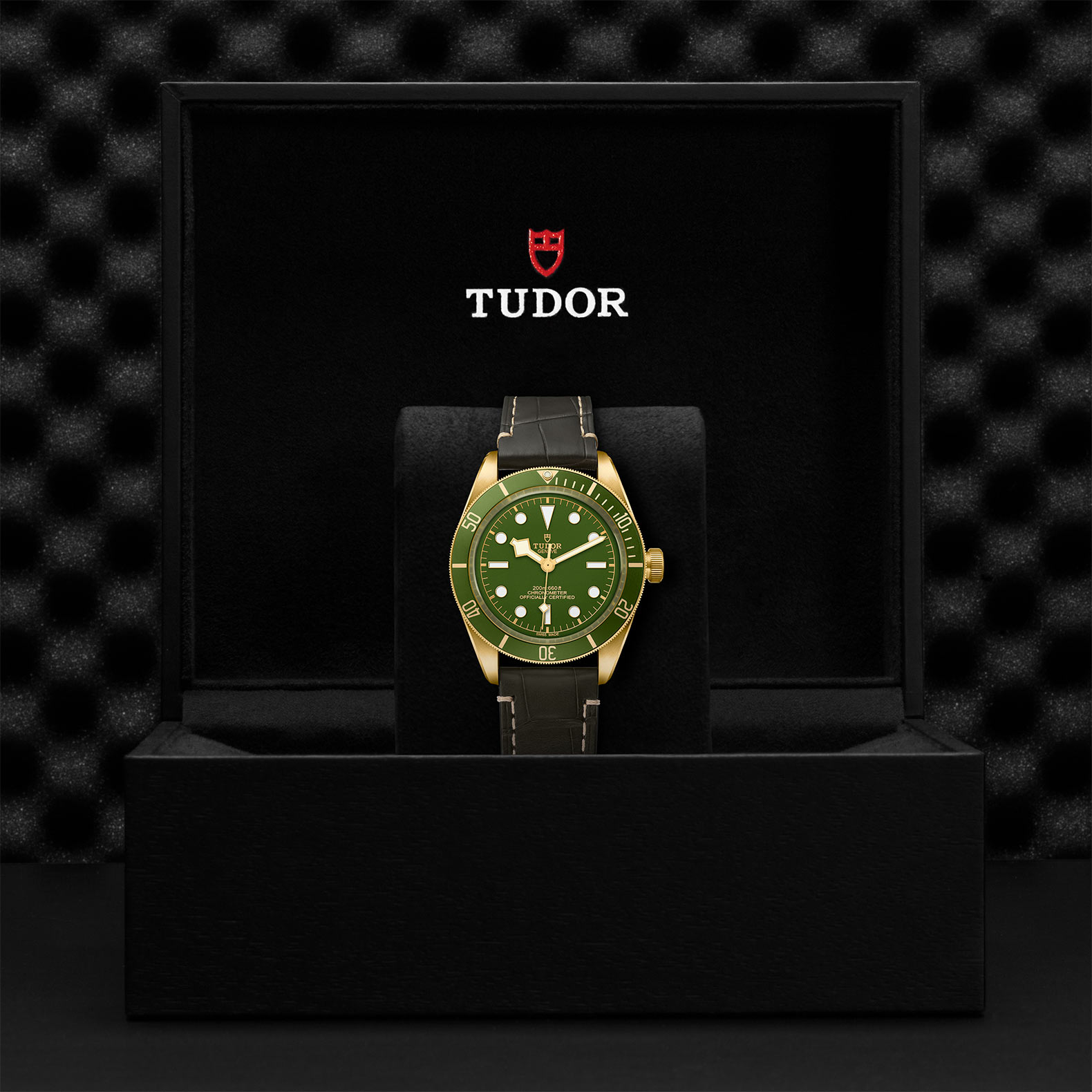 18K黄金单向旋转外圈,配哑光绿色阳极氧化铝60分钟刻度字圈,镀金数字及刻度