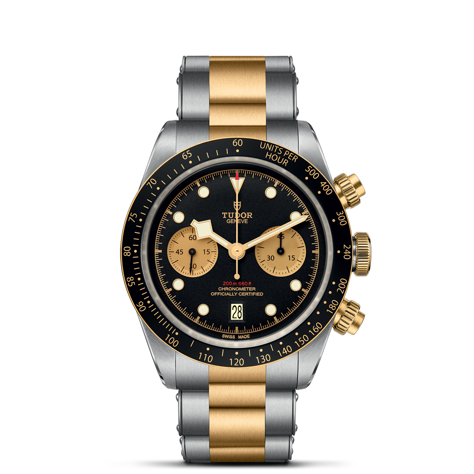 旋入式上链表冠,饰以浮雕帝舵表玫瑰标志;实心黄金旋入式按钮位于2点钟及4点钟位置:由钢芯及0.3毫米黄金包金制成