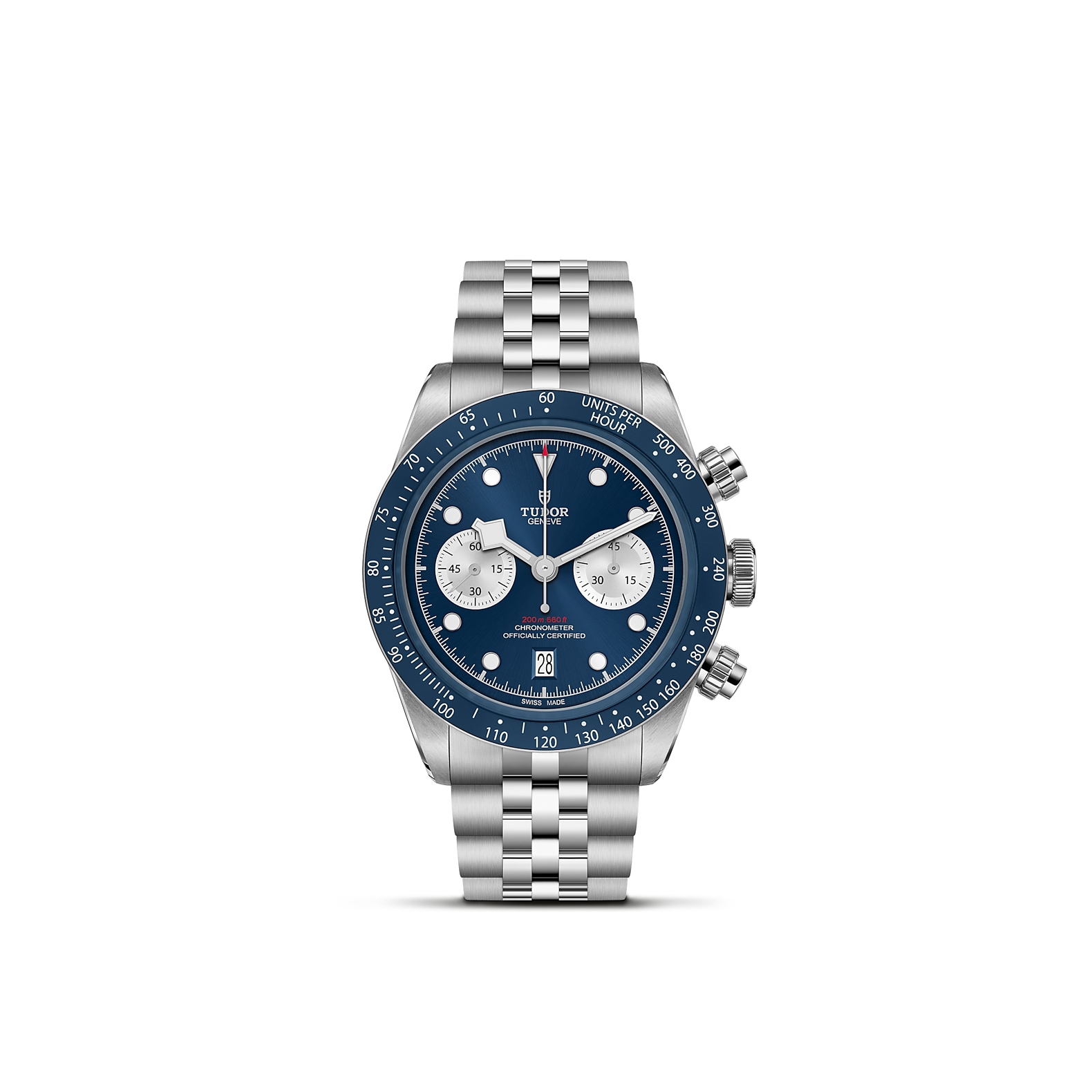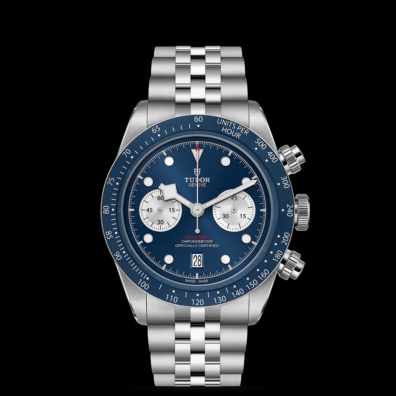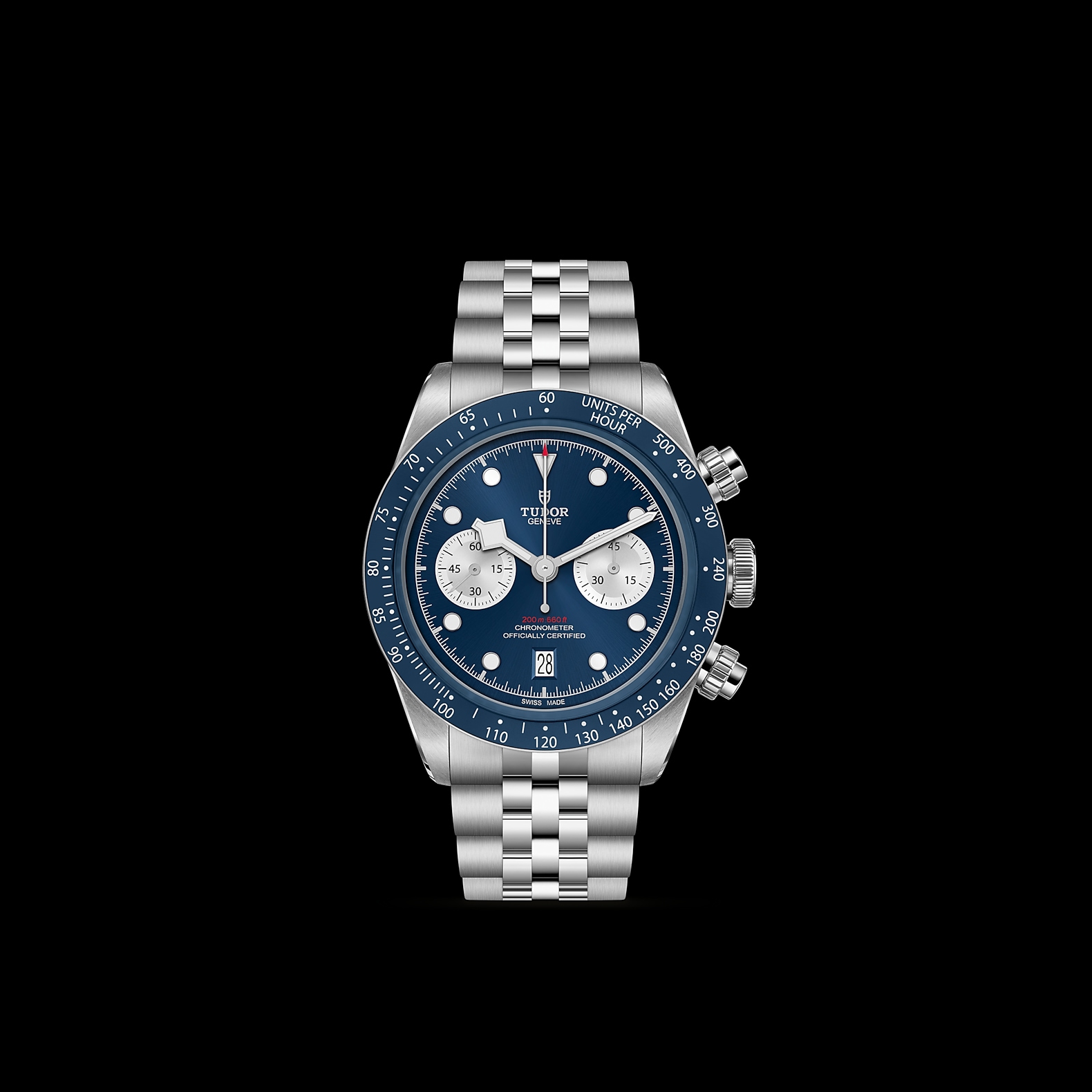 316L不锈钢旋入式上链表冠,饰以浮雕帝舵表玫瑰标志 316L不锈钢旋入式按钮位于2点钟及4点钟位置