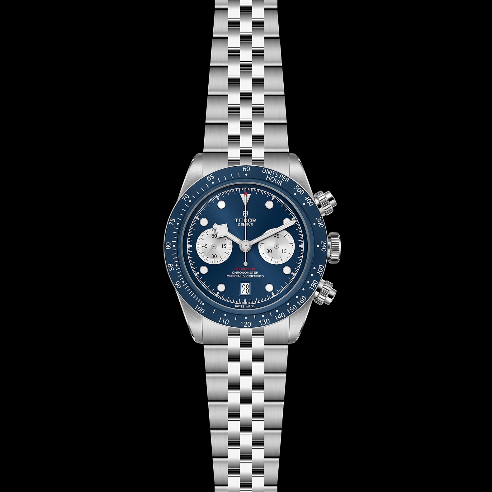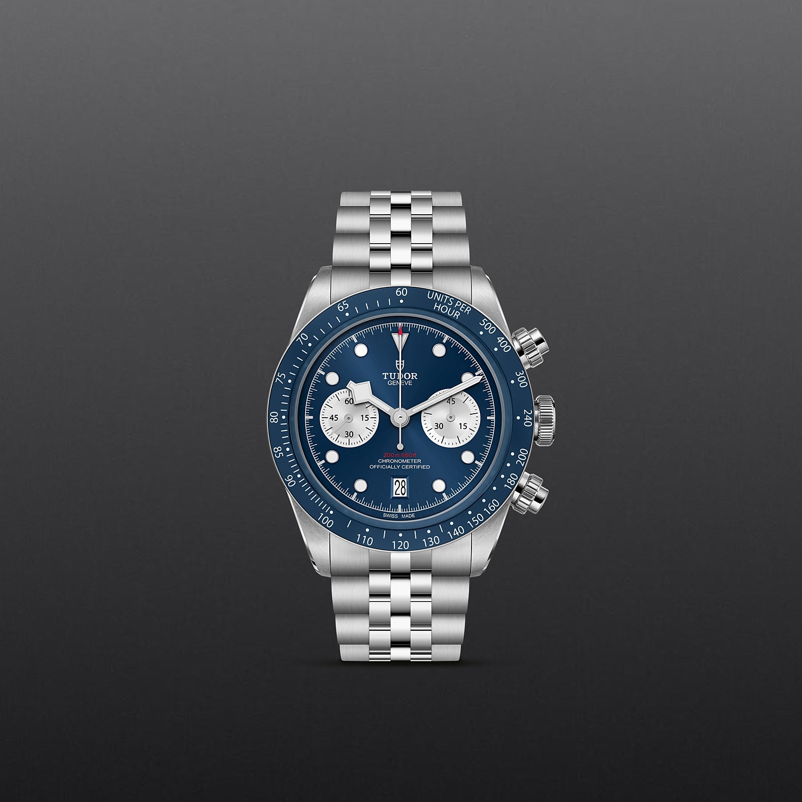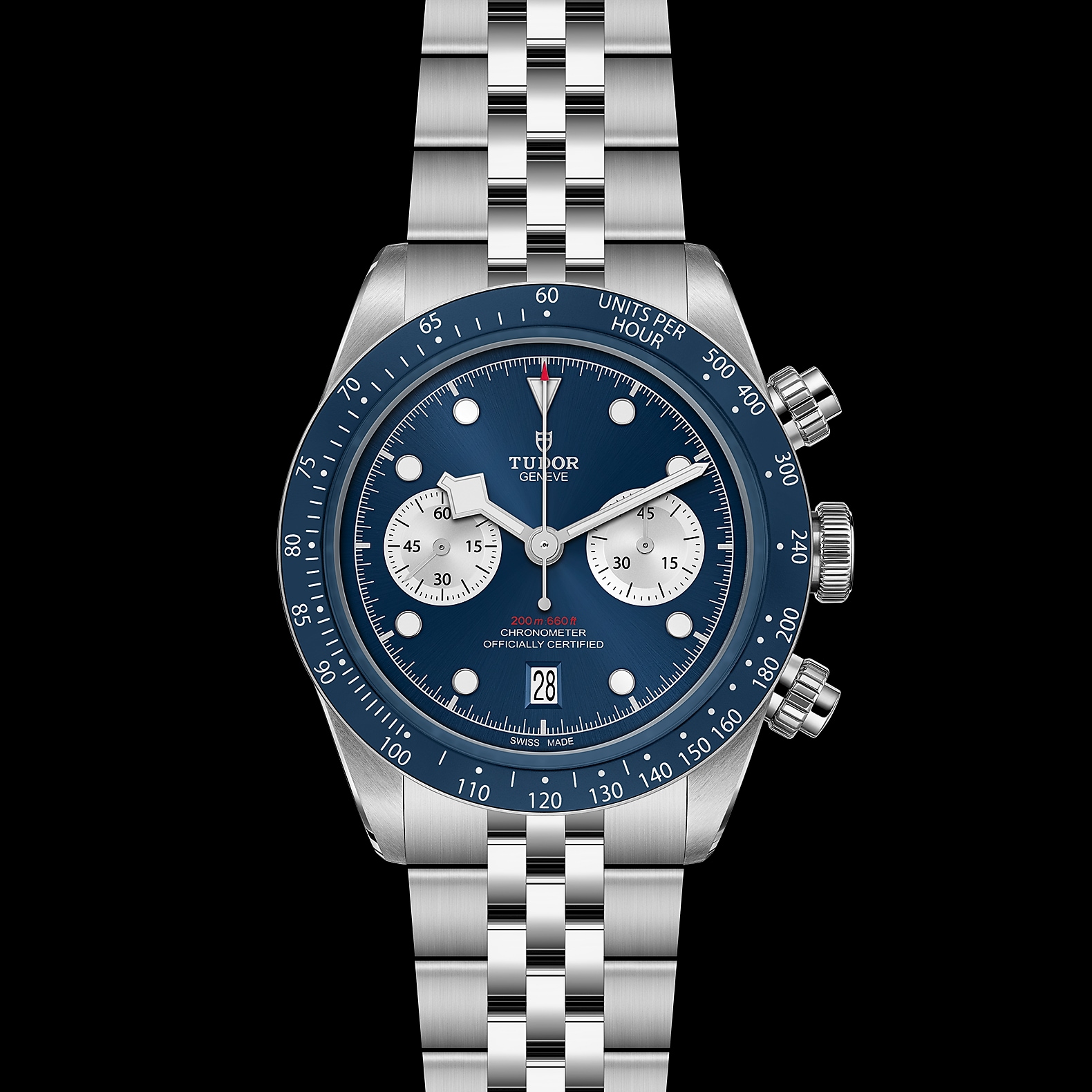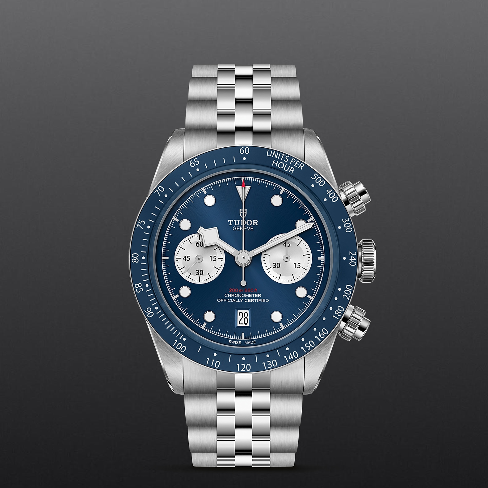 316L不锈钢旋入式上链表冠,饰以浮雕帝舵表玫瑰标志 316L不锈钢旋入式按钮位于2点钟及4点钟位置