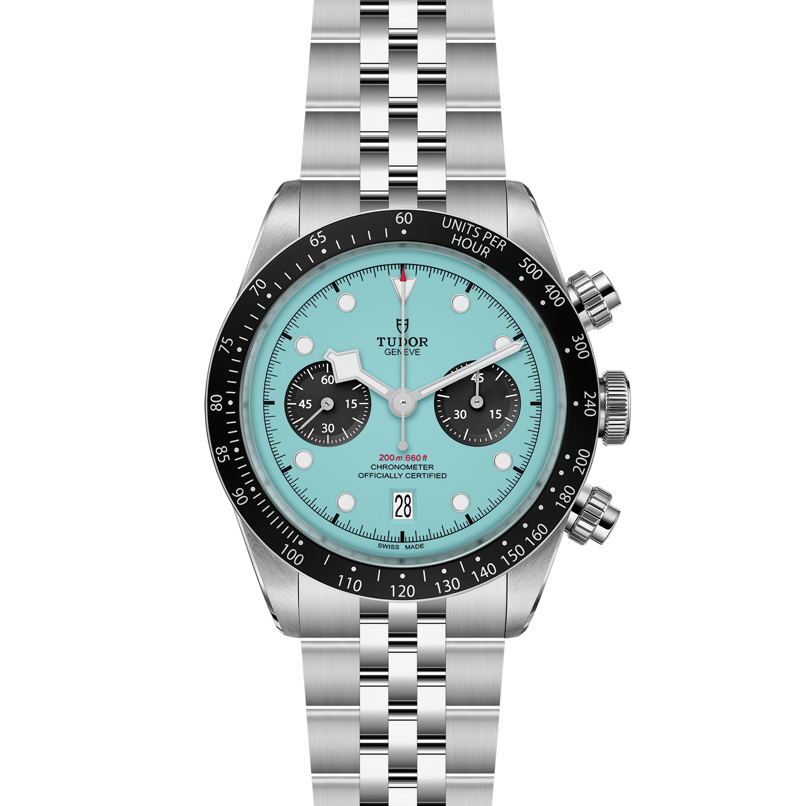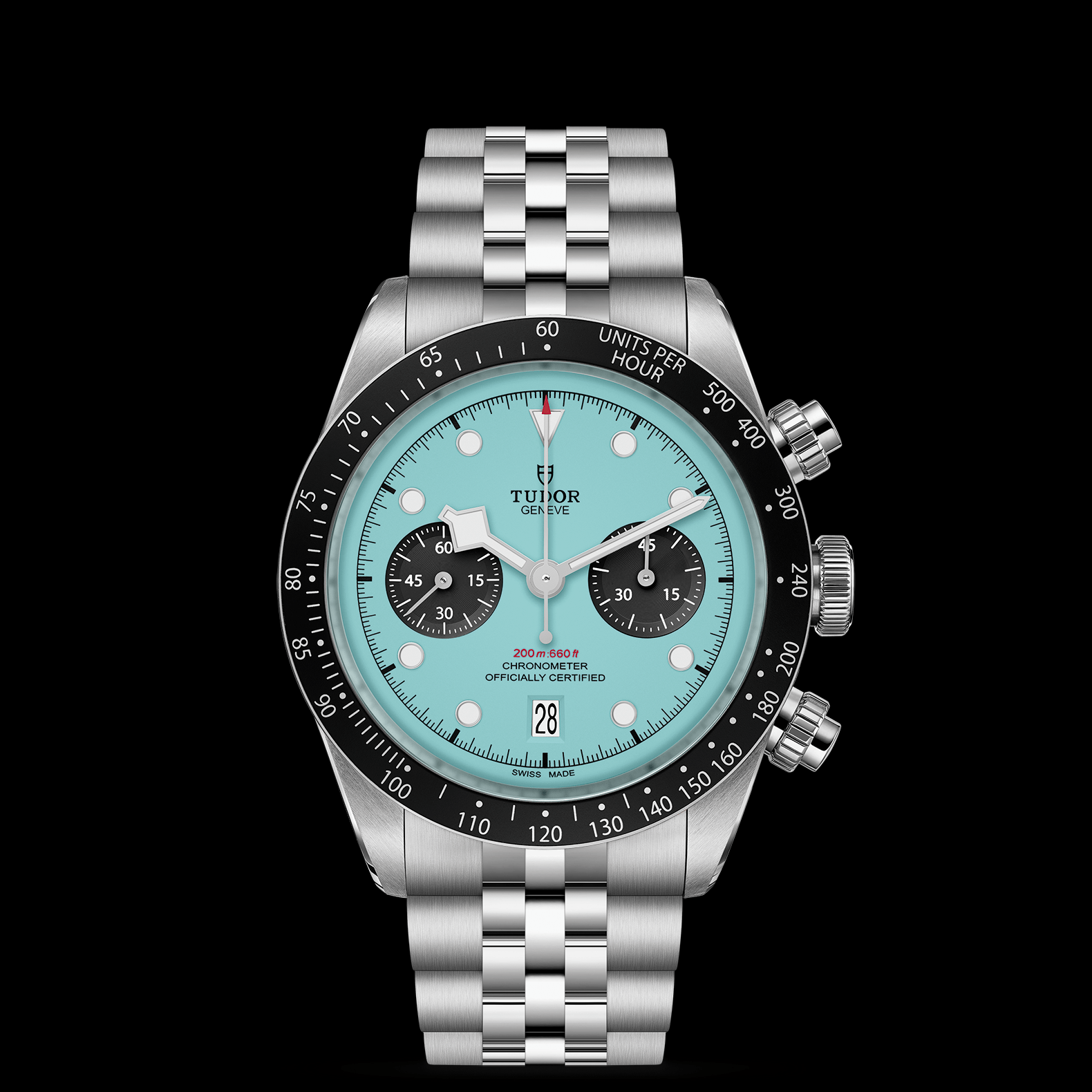 绿松石蓝色表盘配黑色计时盘,圆拱形