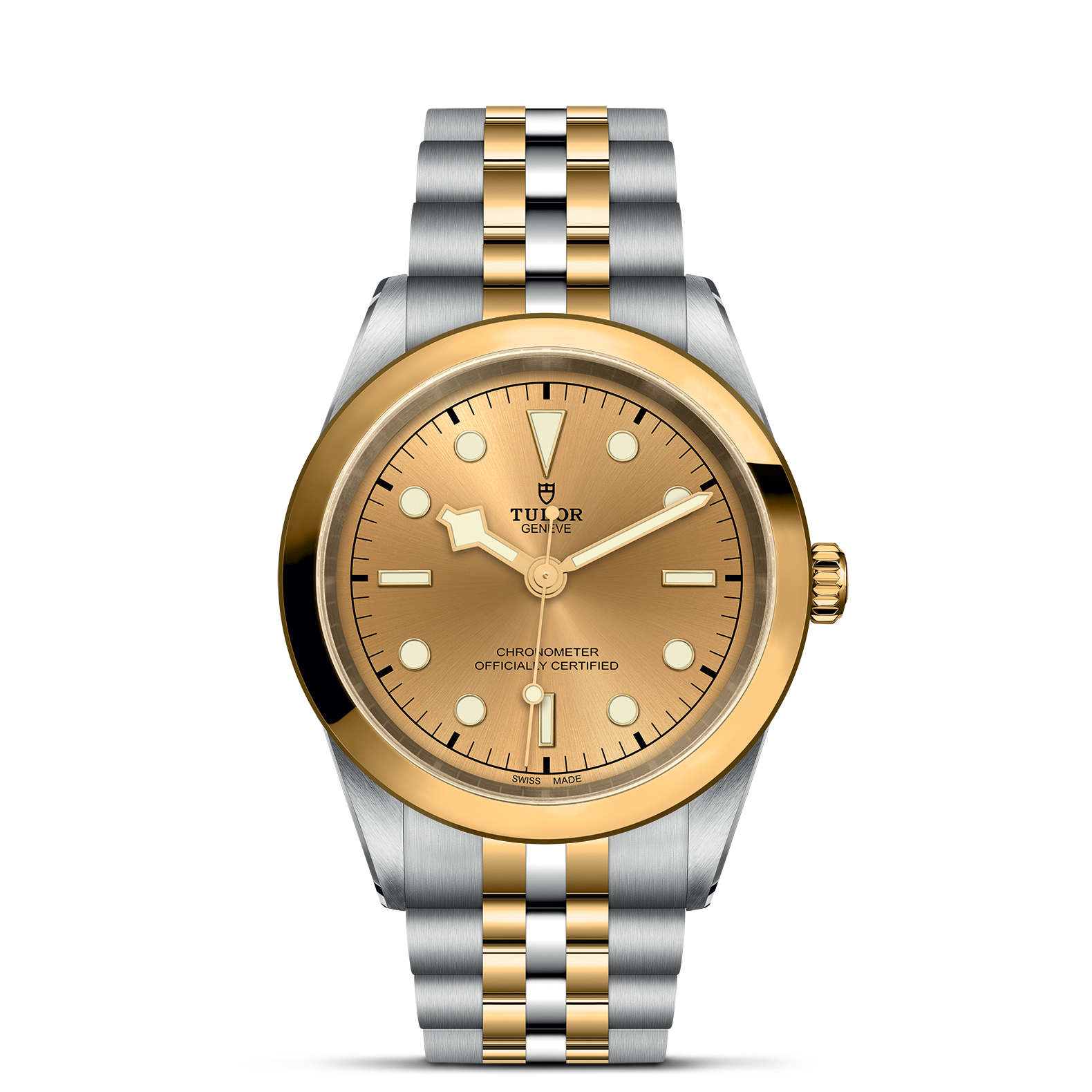 旋入式上链表冠,饰以浮雕帝舵表玫瑰标志;精钢覆有0.1毫米黄金薄层