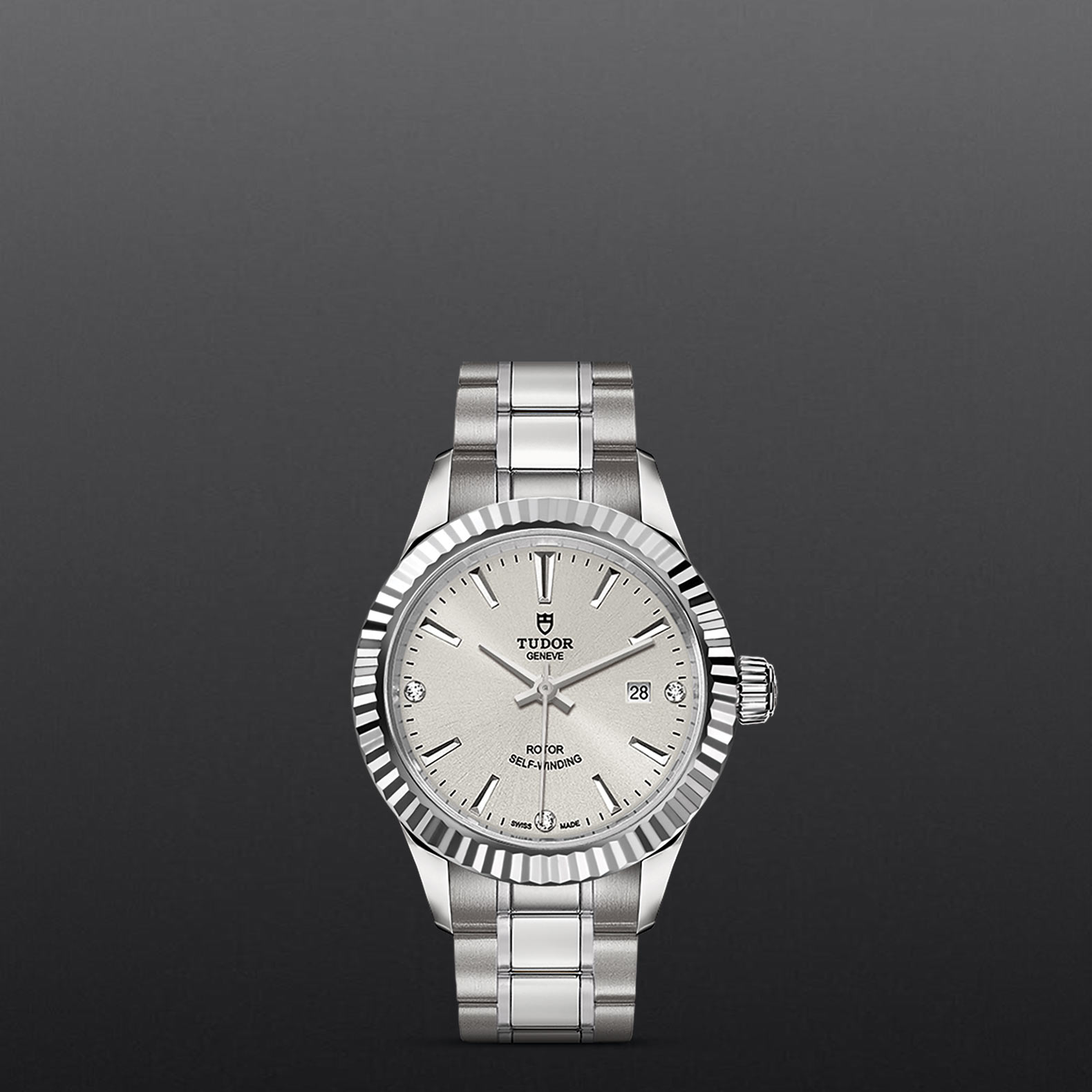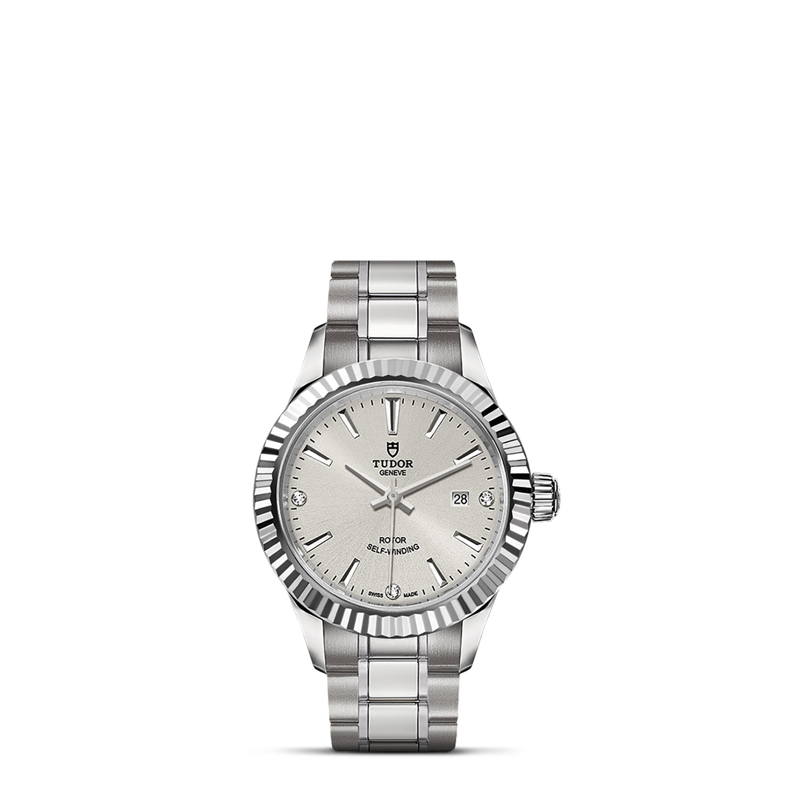 钢,大型款 ≥40毫米,不锈钢三链节表带,经磨光及磨砂处理,链节两侧光滑,配备帝舵表“T-fit”带扣