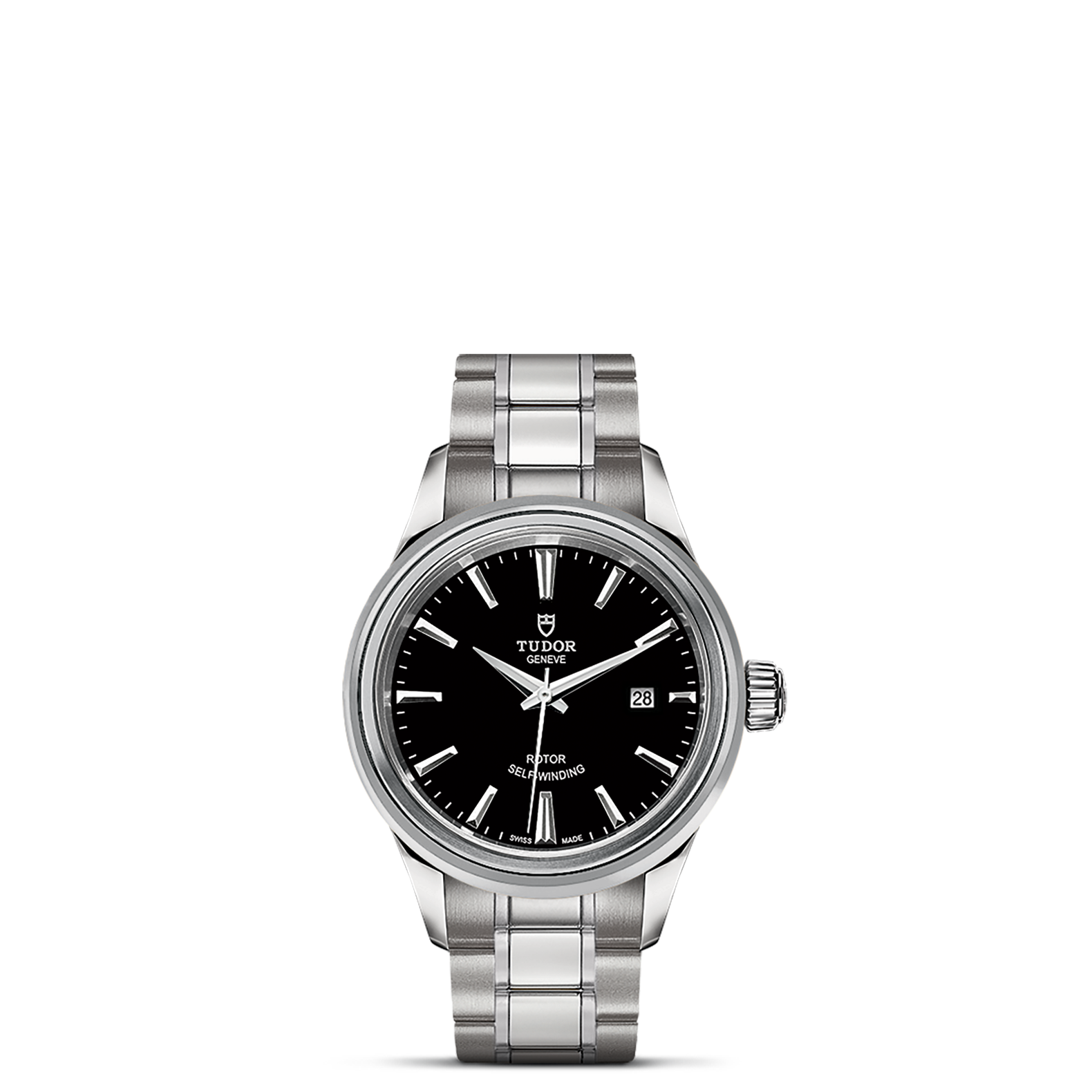 钢,大型款 ≥40毫米,不锈钢三链节表带,经磨光及磨砂处理,链节两侧光滑,配备帝舵表“T-fit”带扣