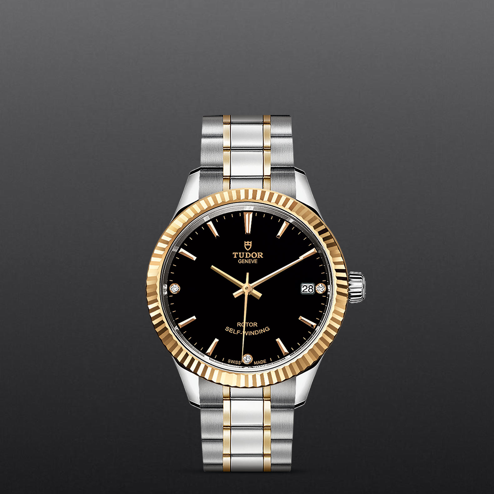 钢,大型款 ≥40毫米,不锈钢三链节表带,经磨光及磨砂处理,链节两侧光滑,配备帝舵表“T-fit”带扣