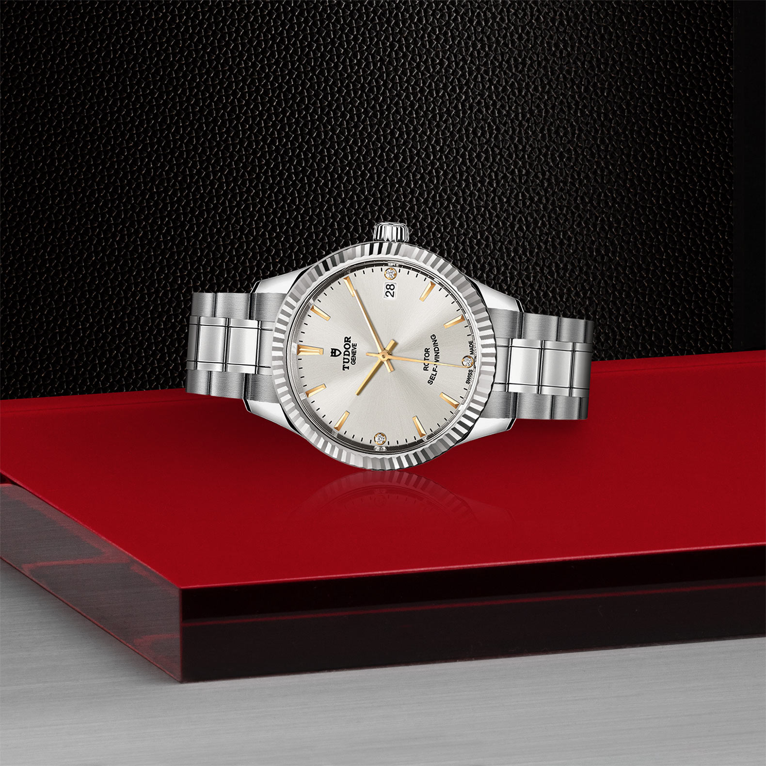 钢,中型款 35至39毫米,钢表带,7排链节,外侧链节表面磨砂,中间链节磨光,配摺扣及保险扣