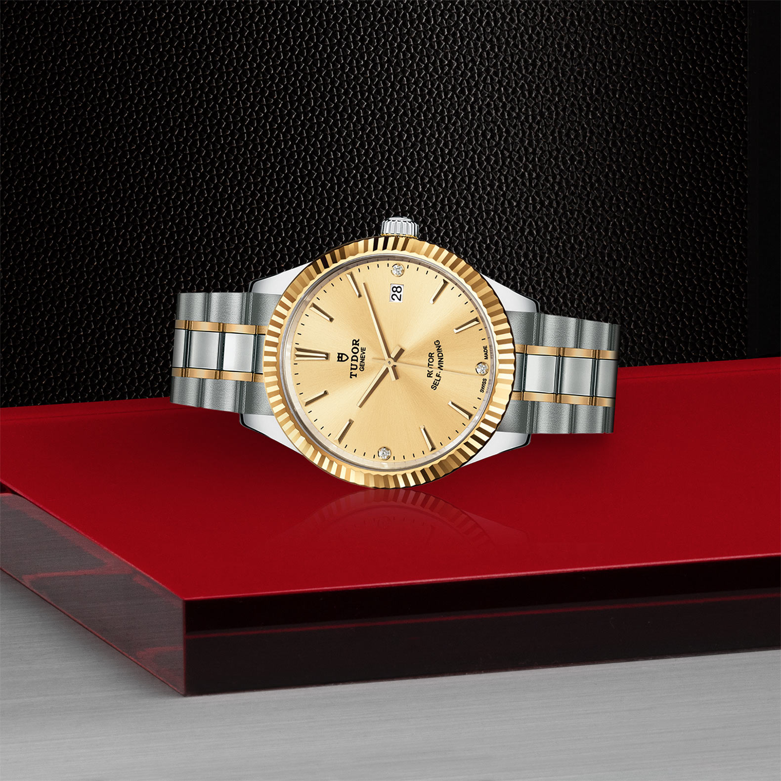 钢,大型款 ≥40毫米,不锈钢三链节表带,经磨光及磨砂处理,链节两侧光滑,配备帝舵表“T-fit”带扣