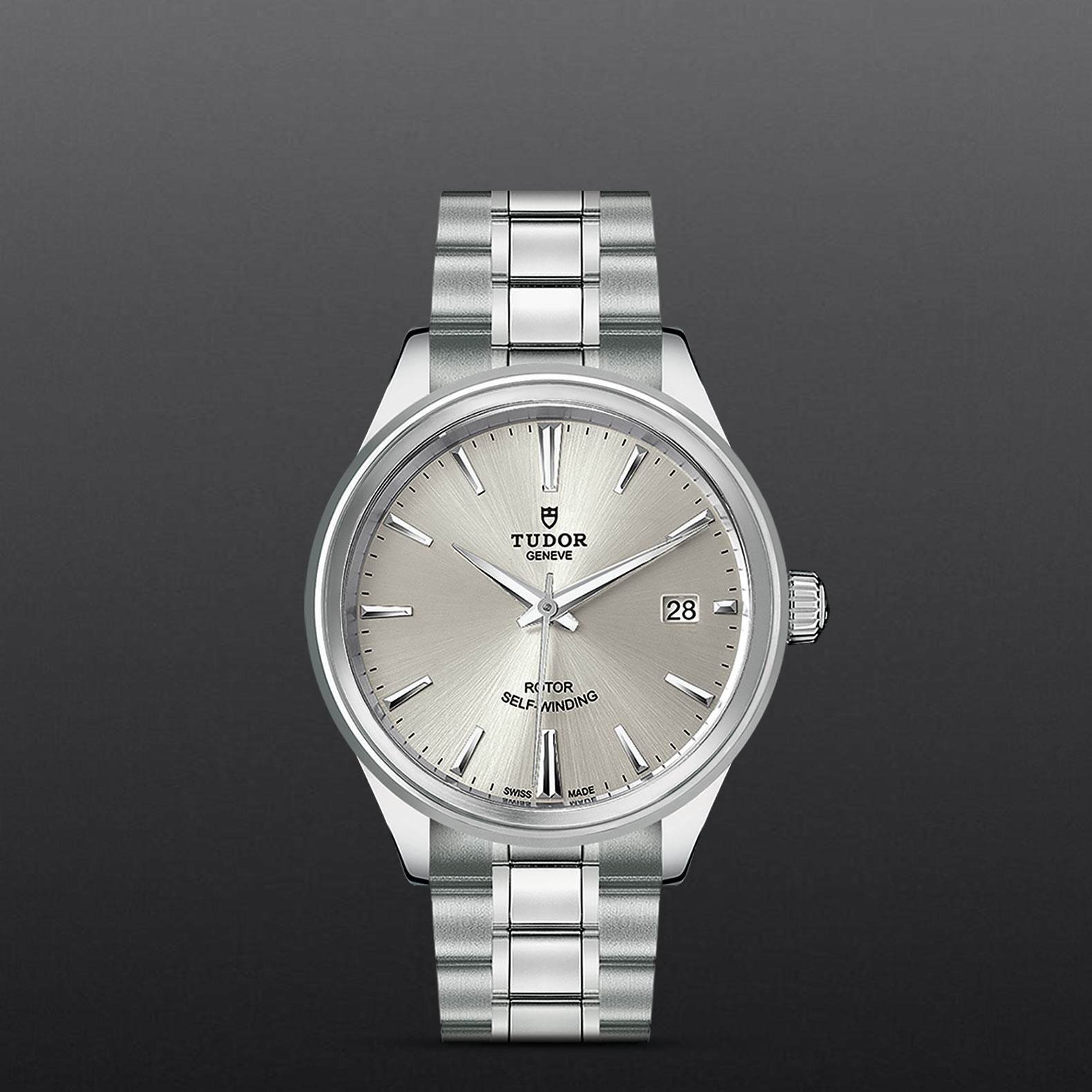钢,大型款 ≥40毫米,不锈钢三链节表带,经磨光及磨砂处理,链节两侧光滑,配备帝舵表“T-fit”带扣