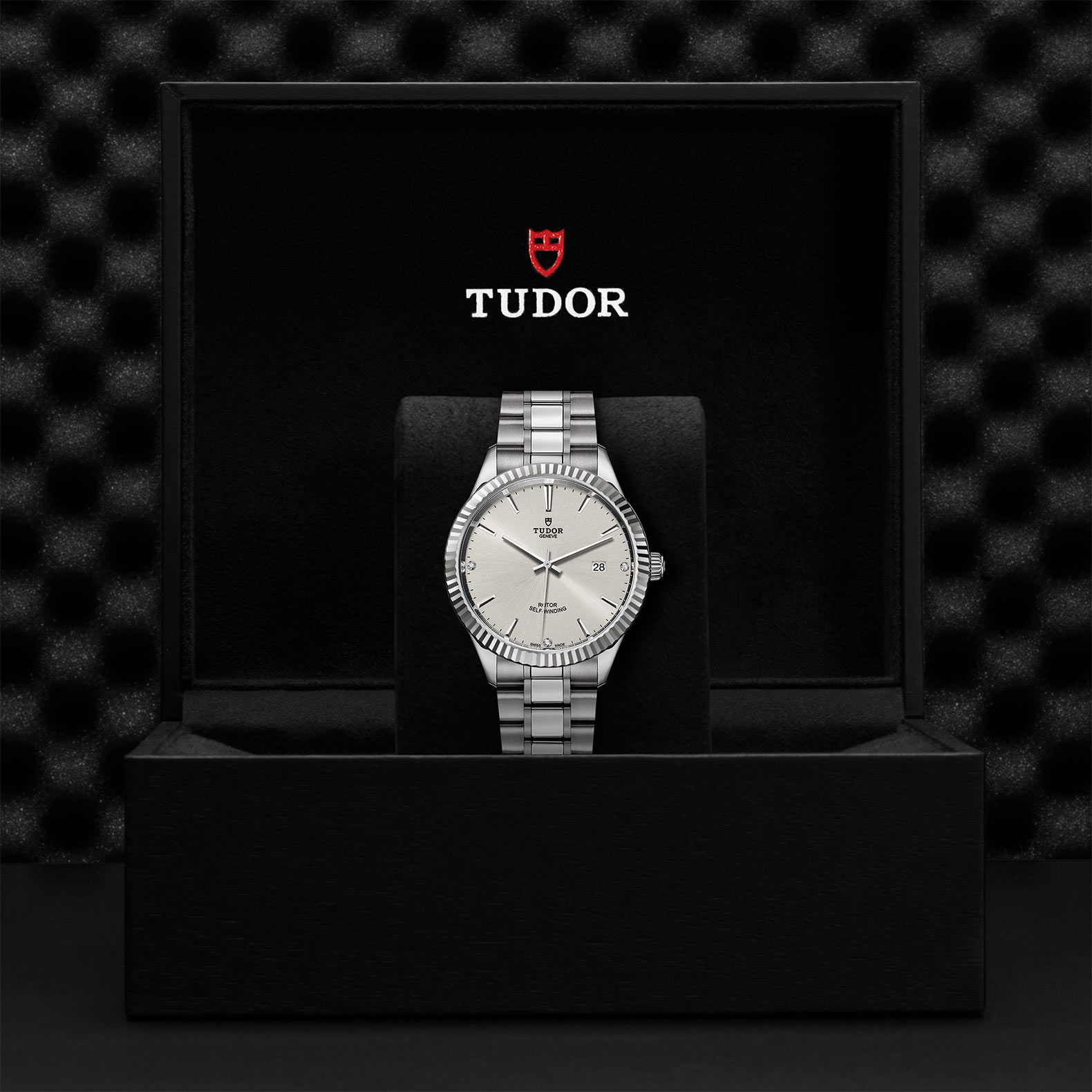 钢,小型款≤34毫米,316L钢一体式表带,5排链节,外侧及中间链节经磨砂处理,间隔链节精细磨光,配摺扣及保险扣