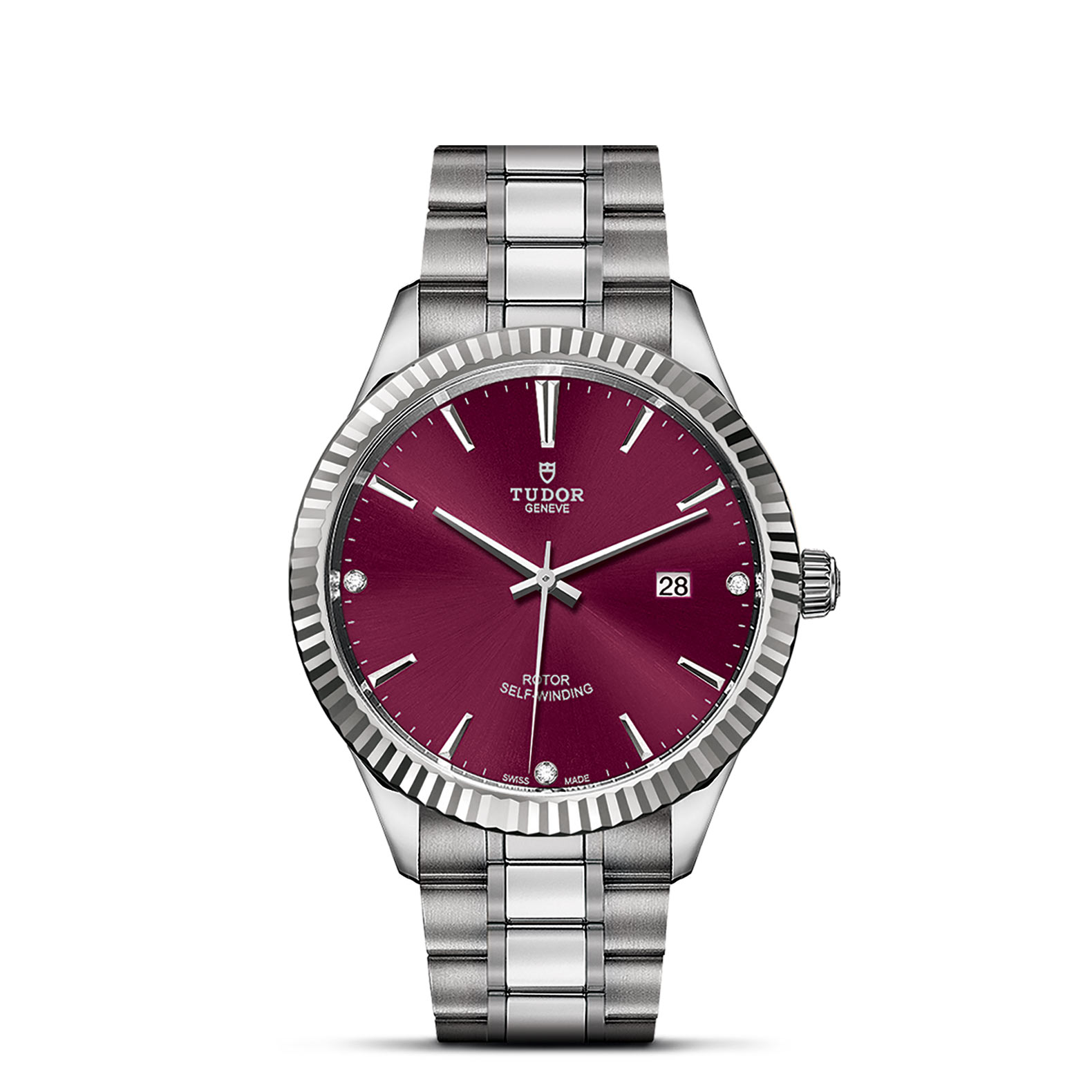 钢,大型款 ≥40毫米,不锈钢三链节表带,经磨光及磨砂处理,链节两侧光滑,配备帝舵表“T-fit”带扣