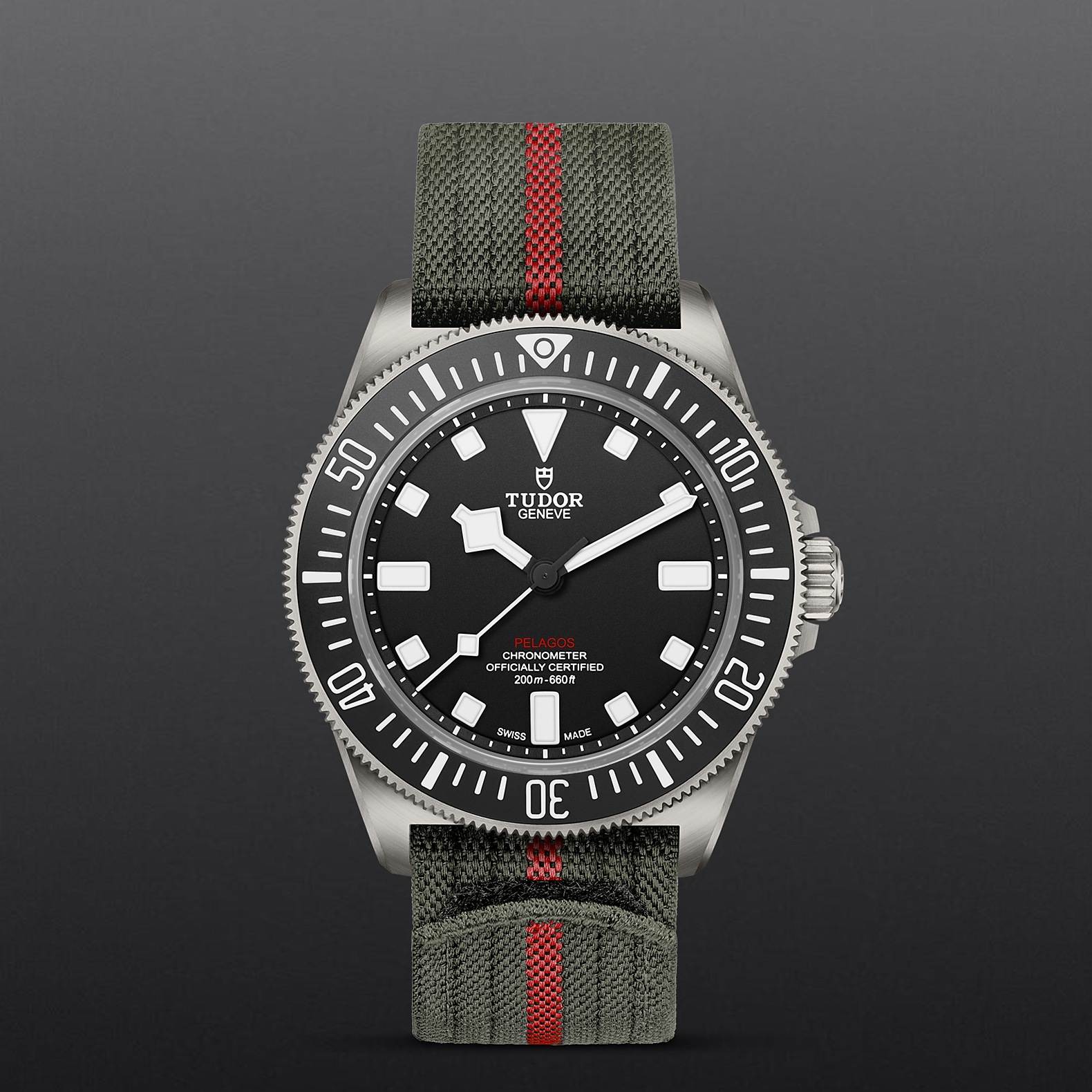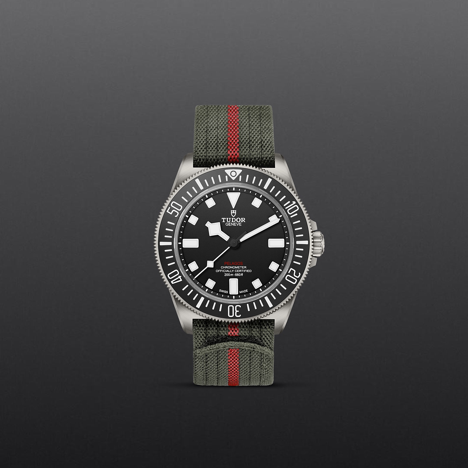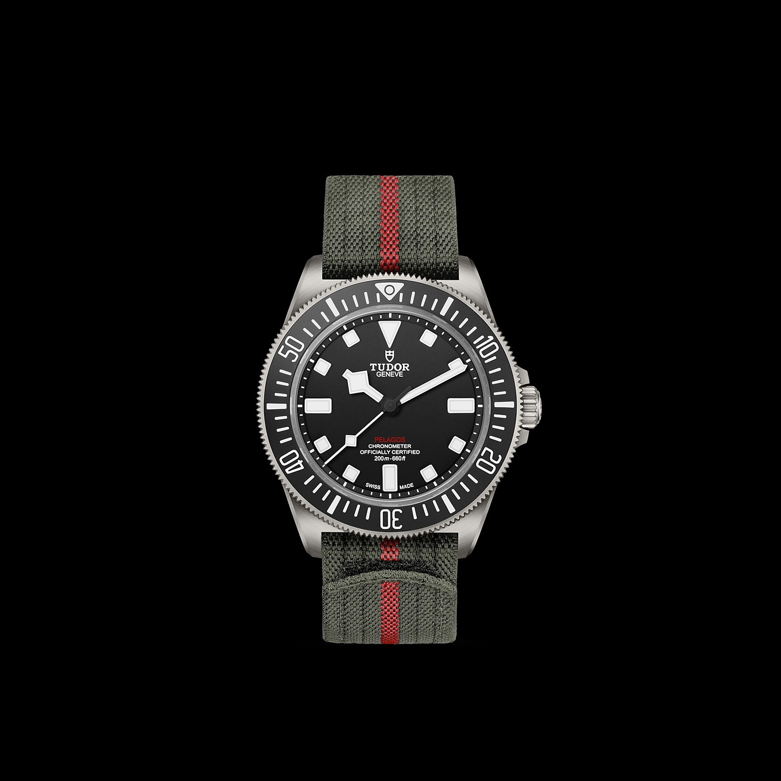 军绿色织纹表带,中央饰以红色条纹,配自黏式带扣