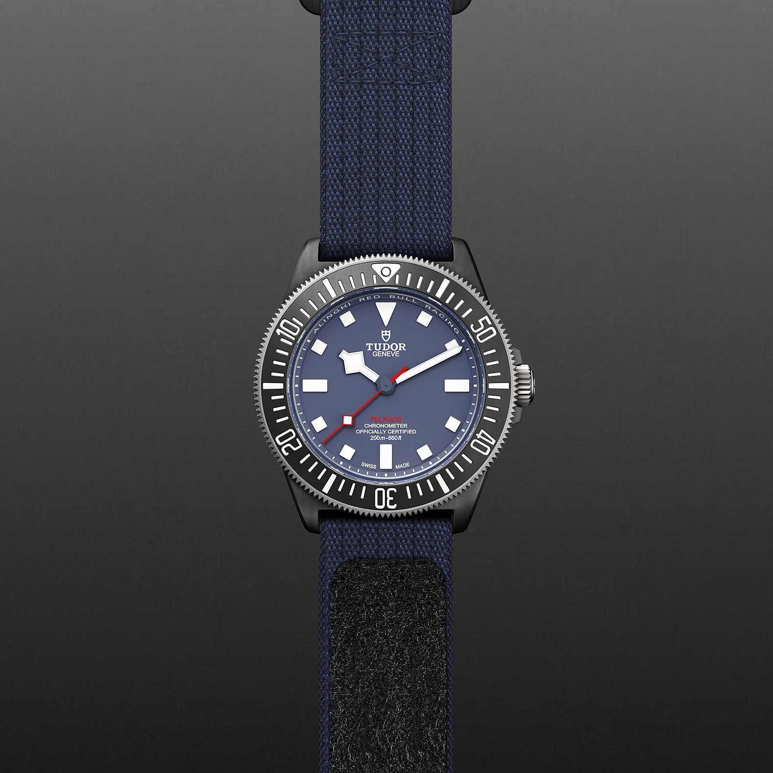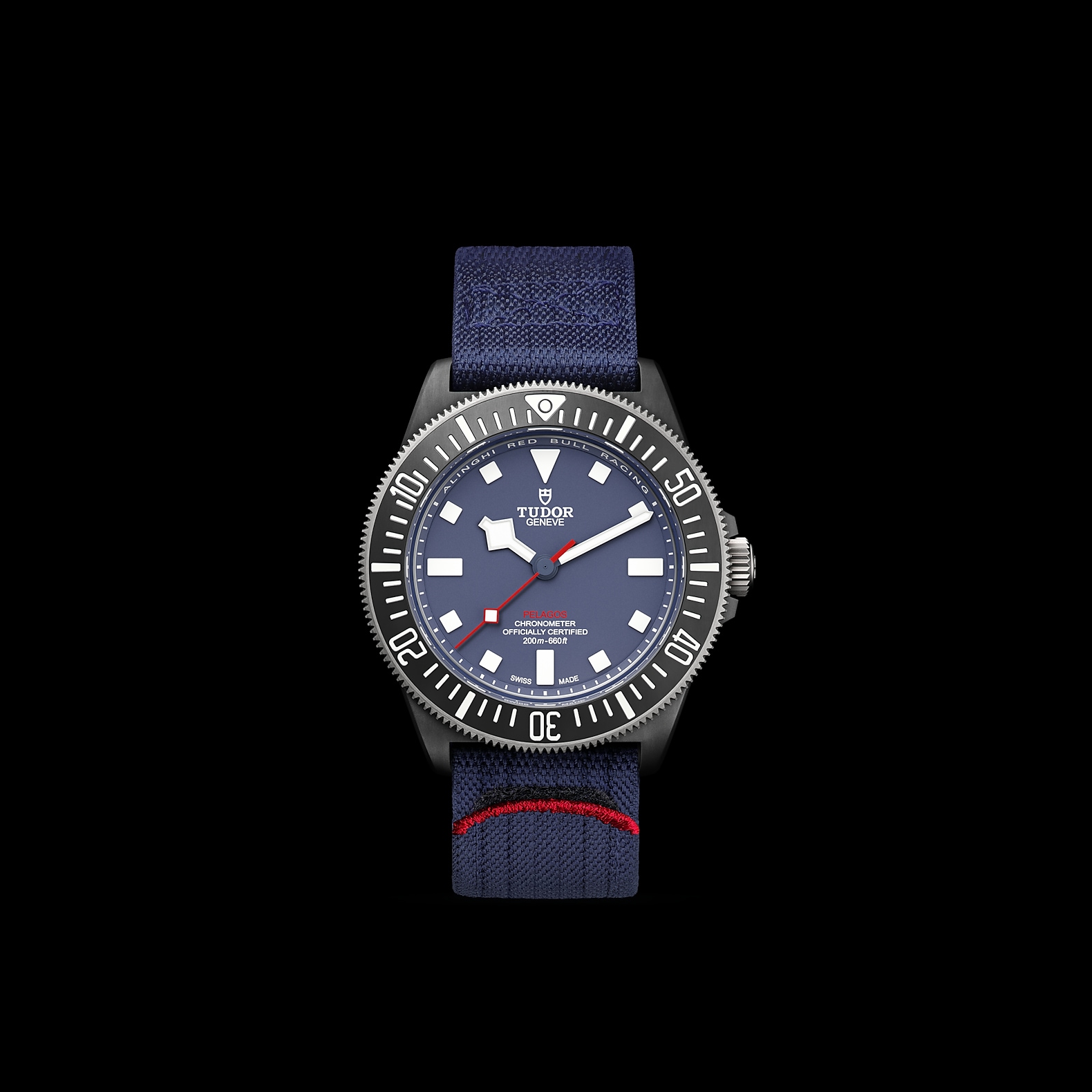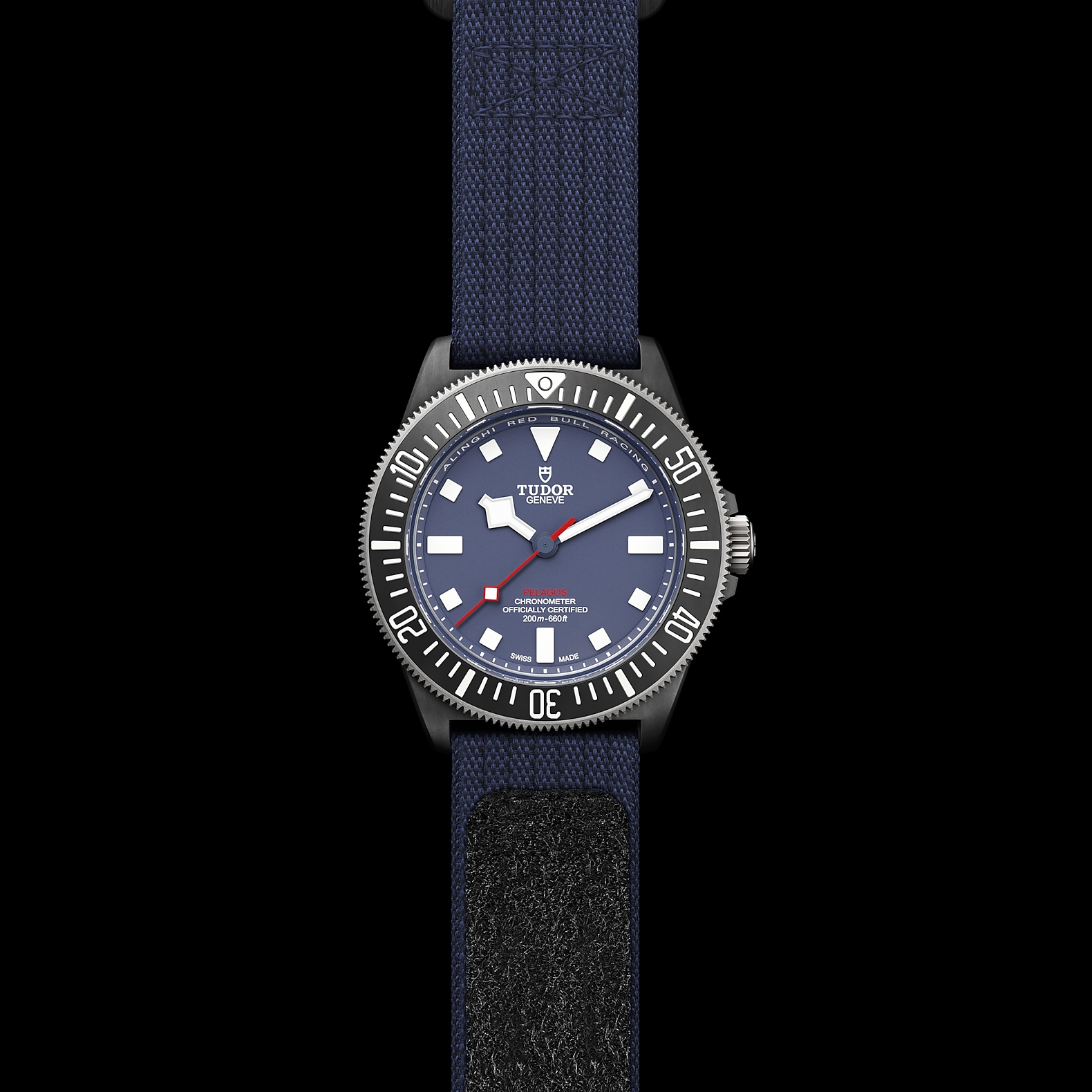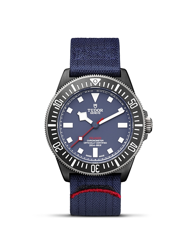 42毫米黑色碳复合材质表壳,哑光饰面,表壳底盖刻有阿灵基红牛帆船队标志