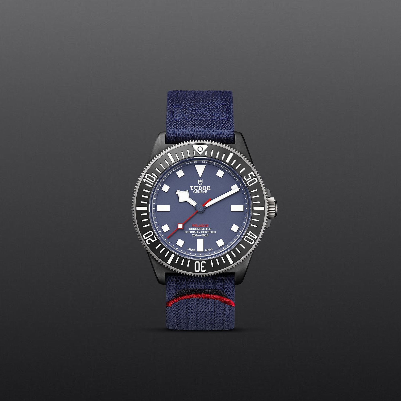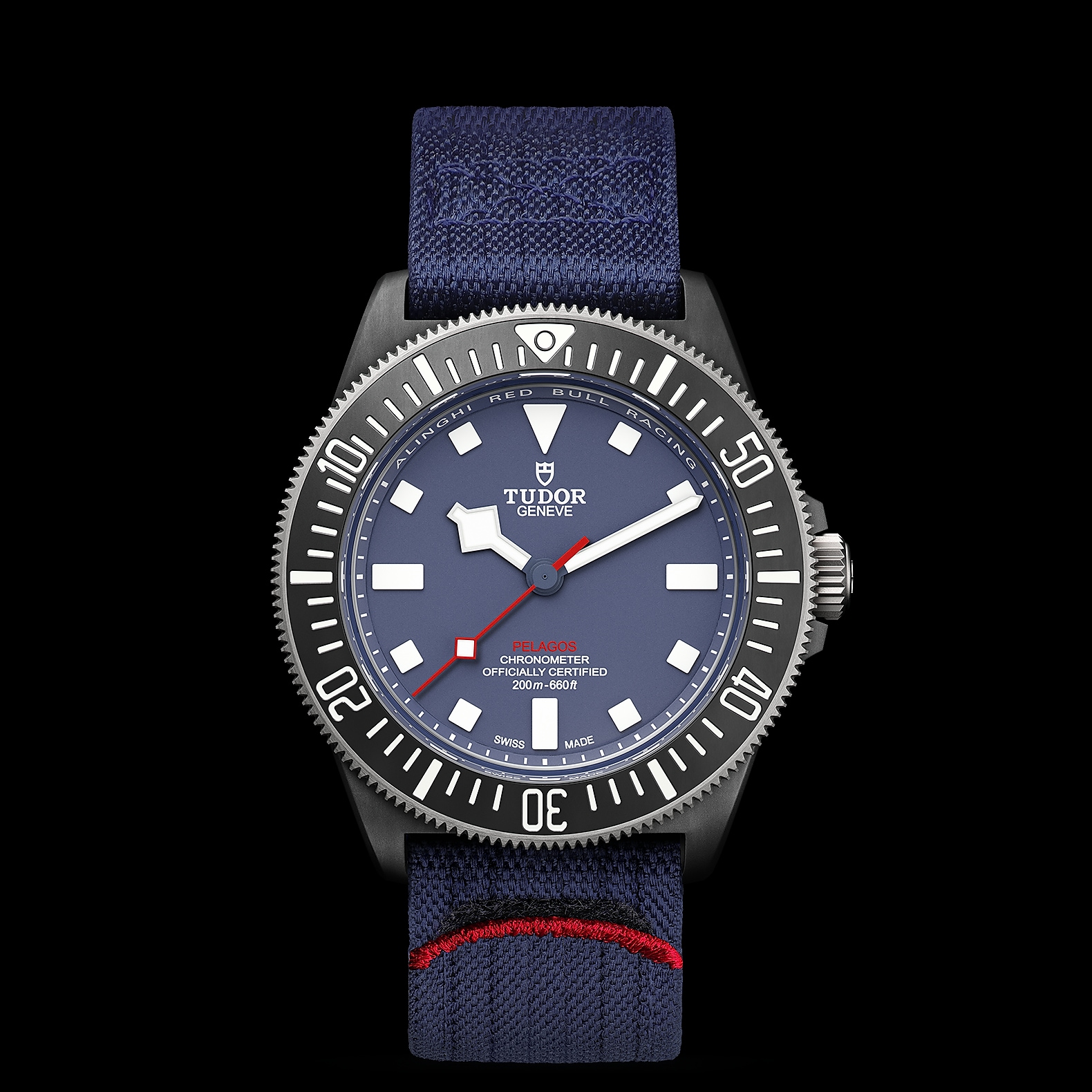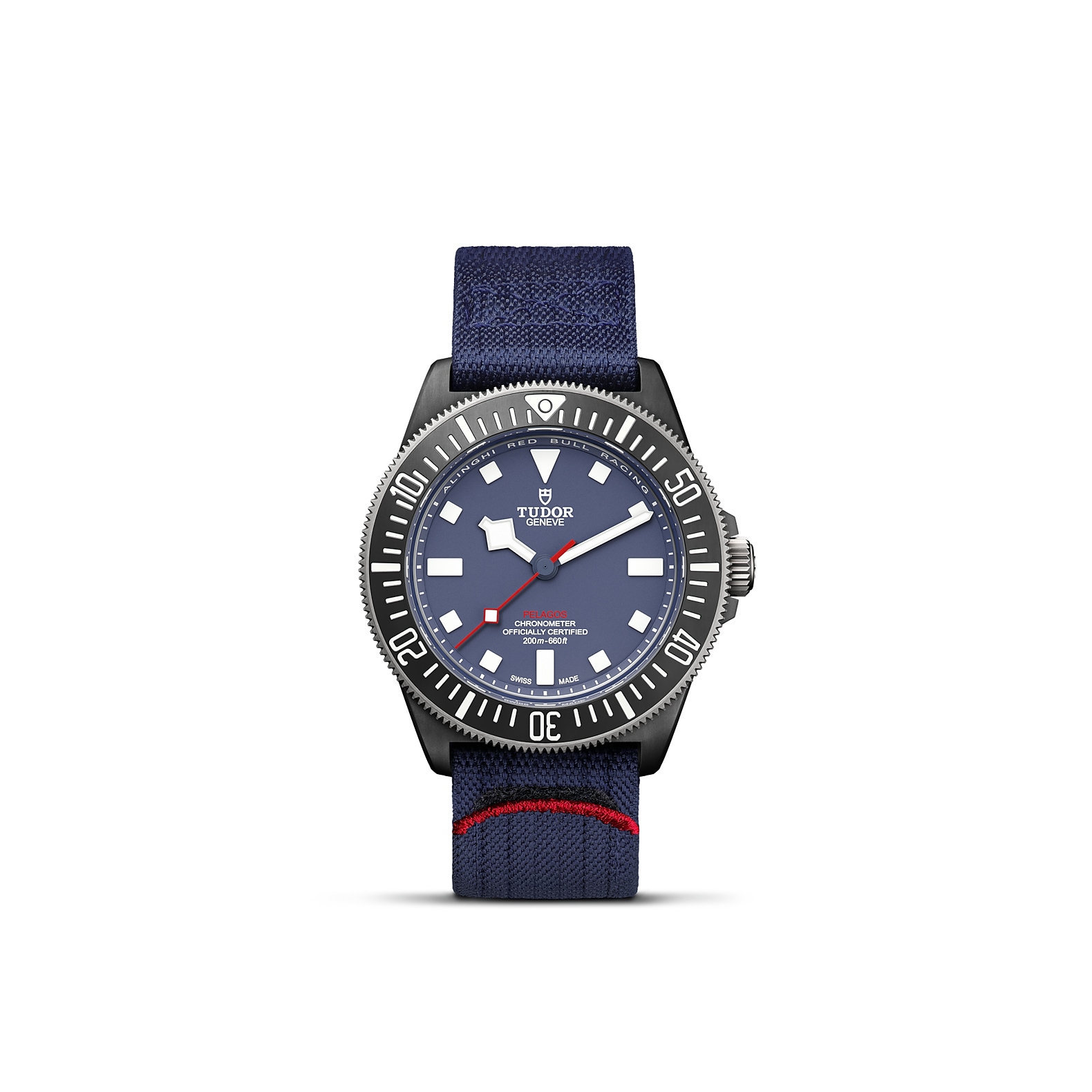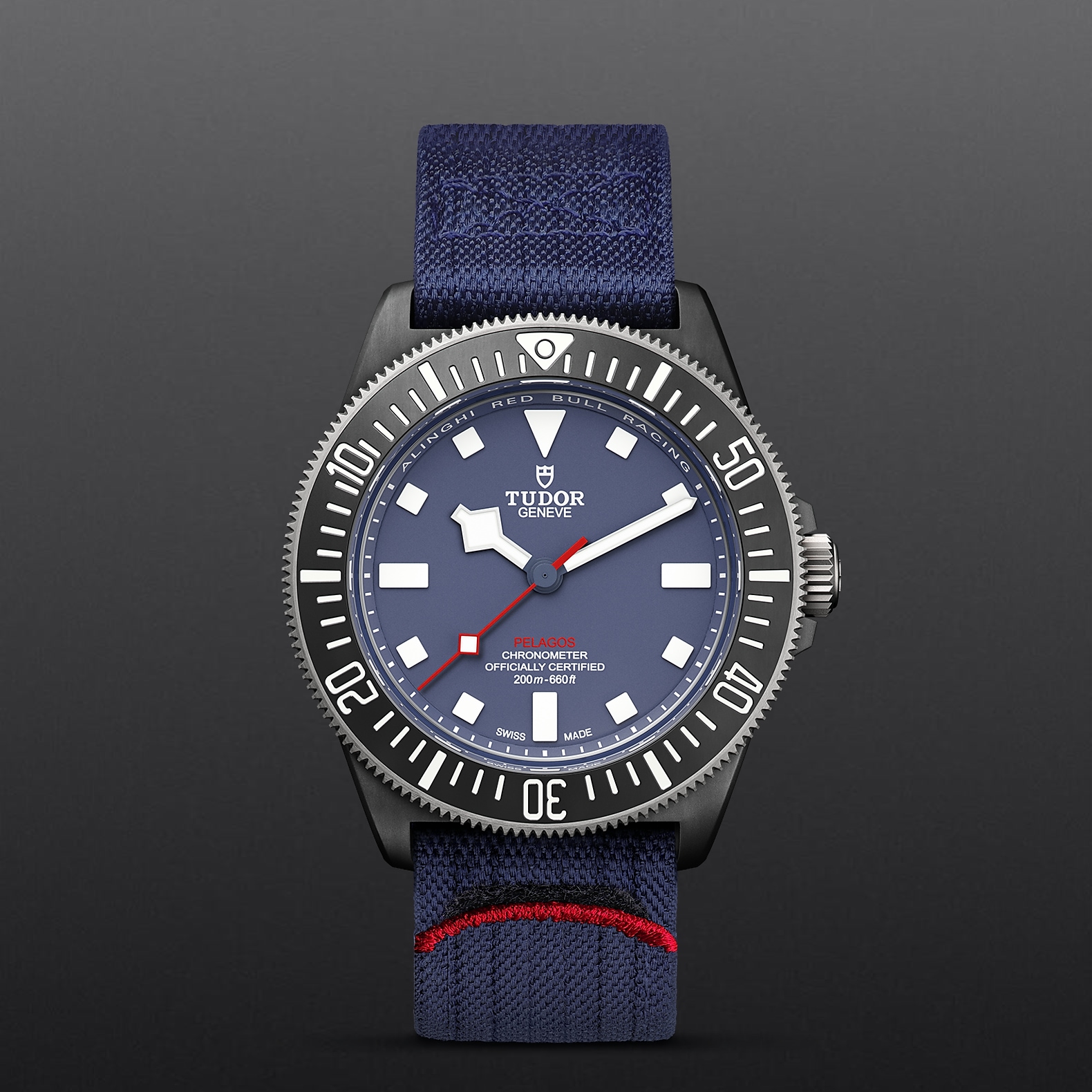 42毫米黑色碳复合材质表壳,哑光饰面,表壳底盖刻有阿灵基红牛帆船队标志
