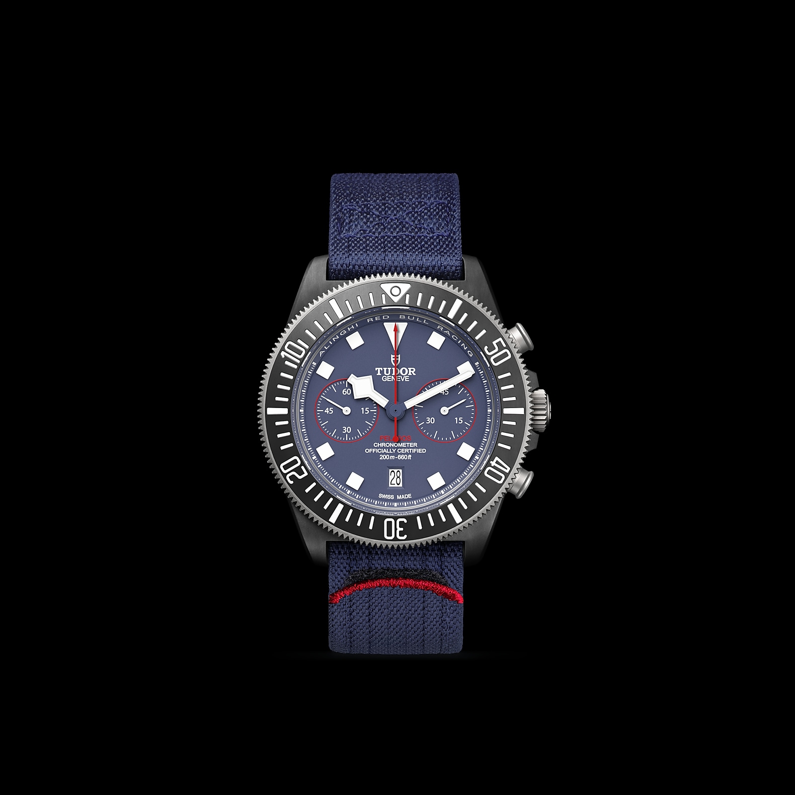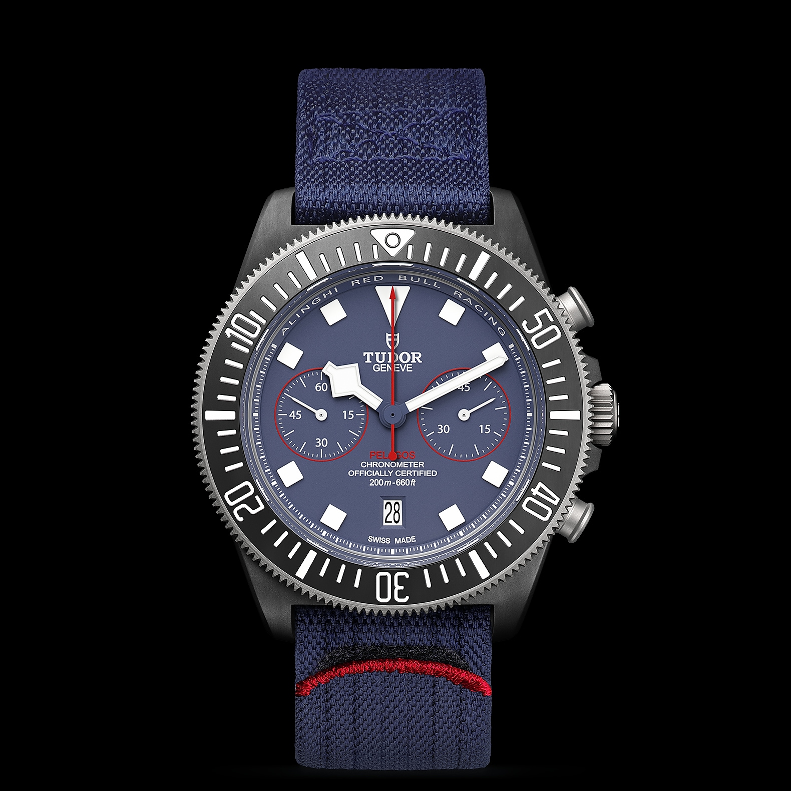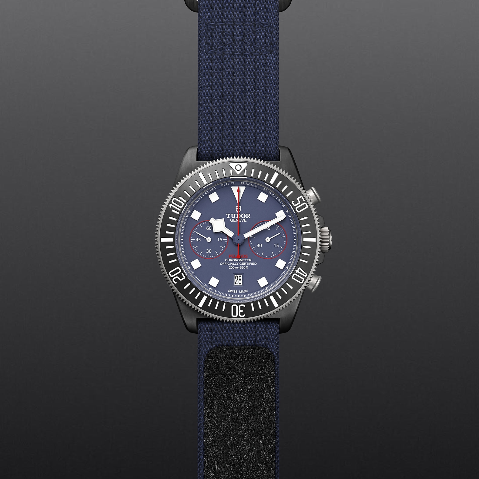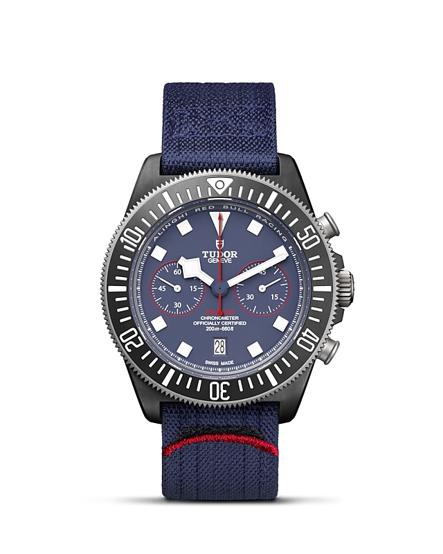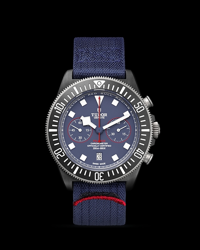 哑光蓝色,计时盘点缀红色装饰
