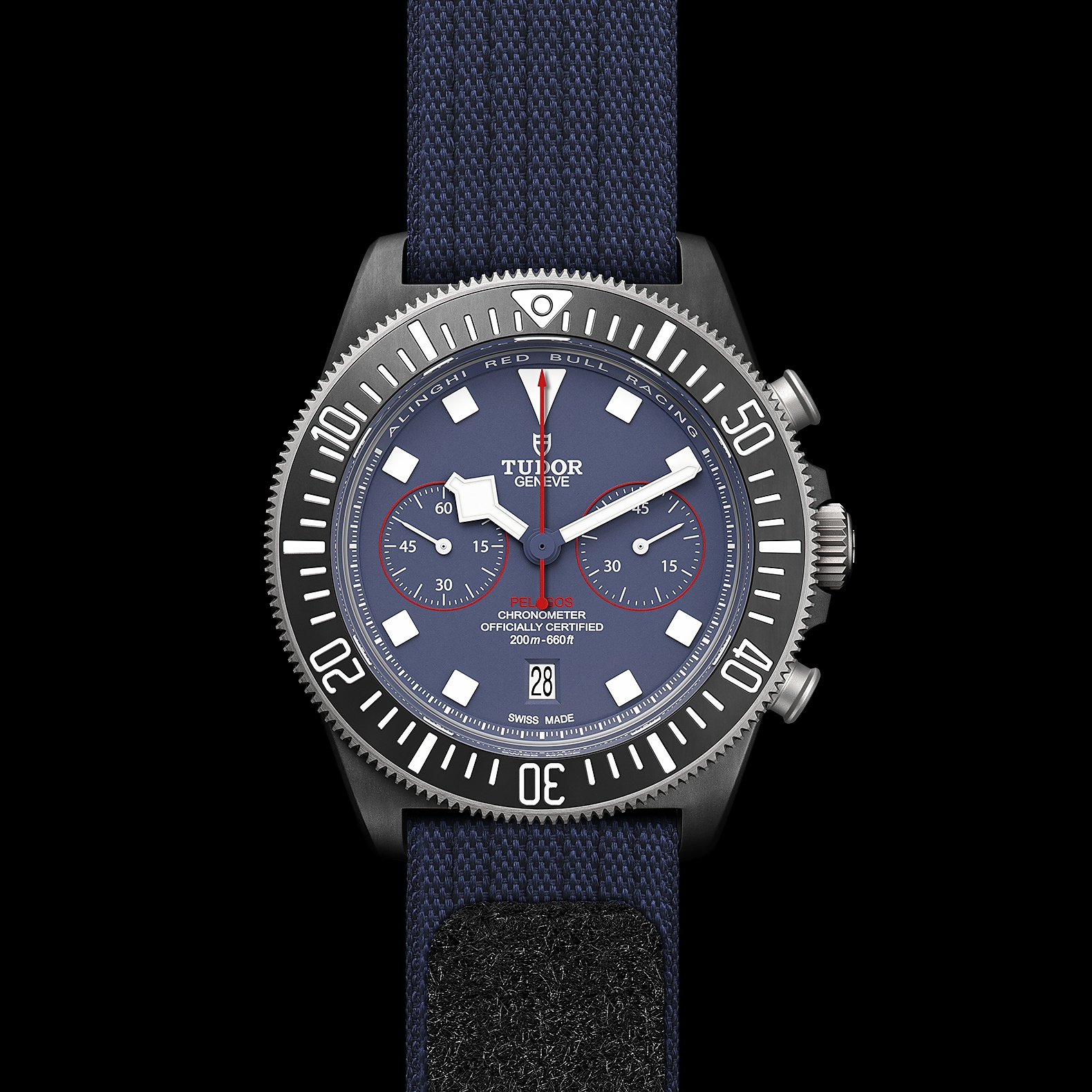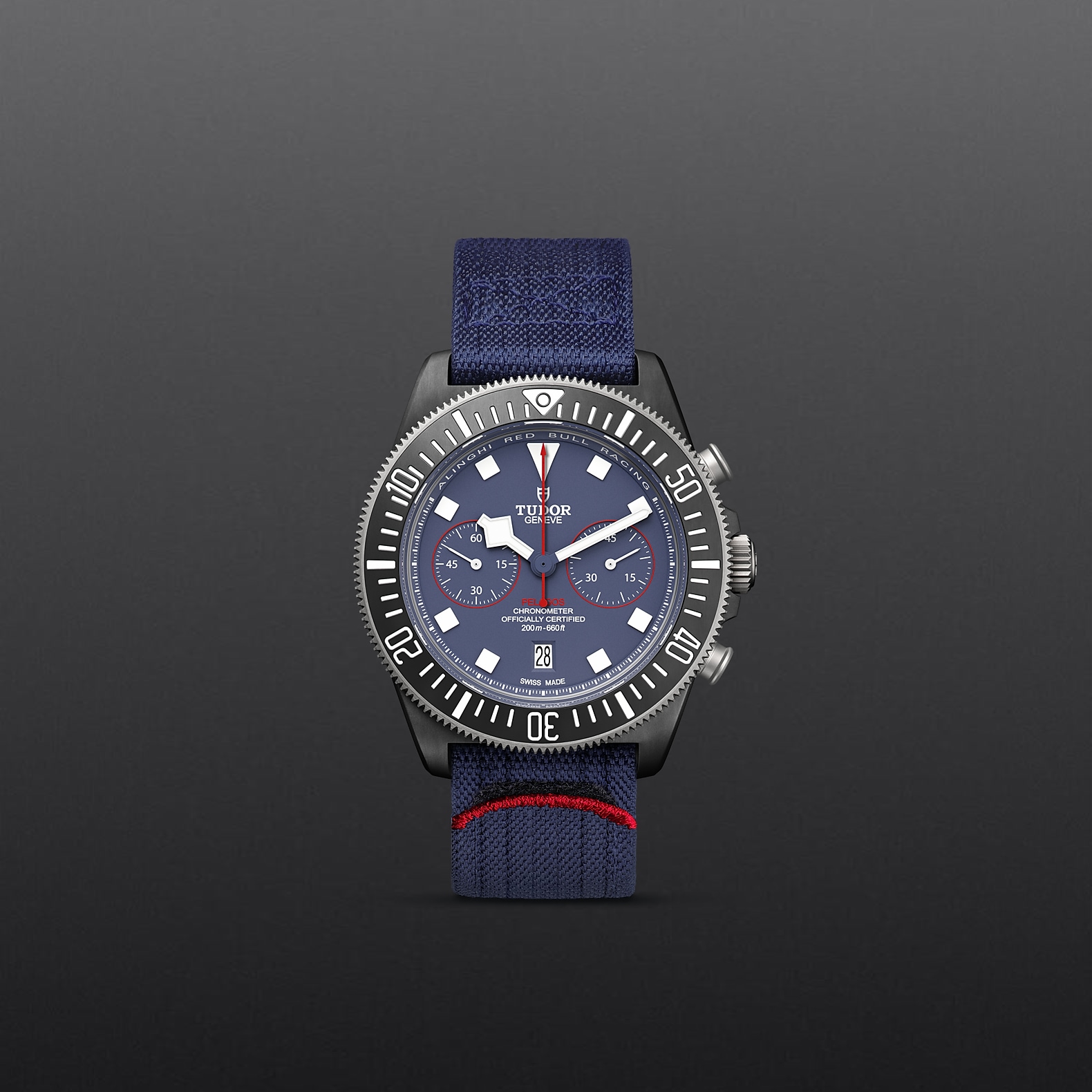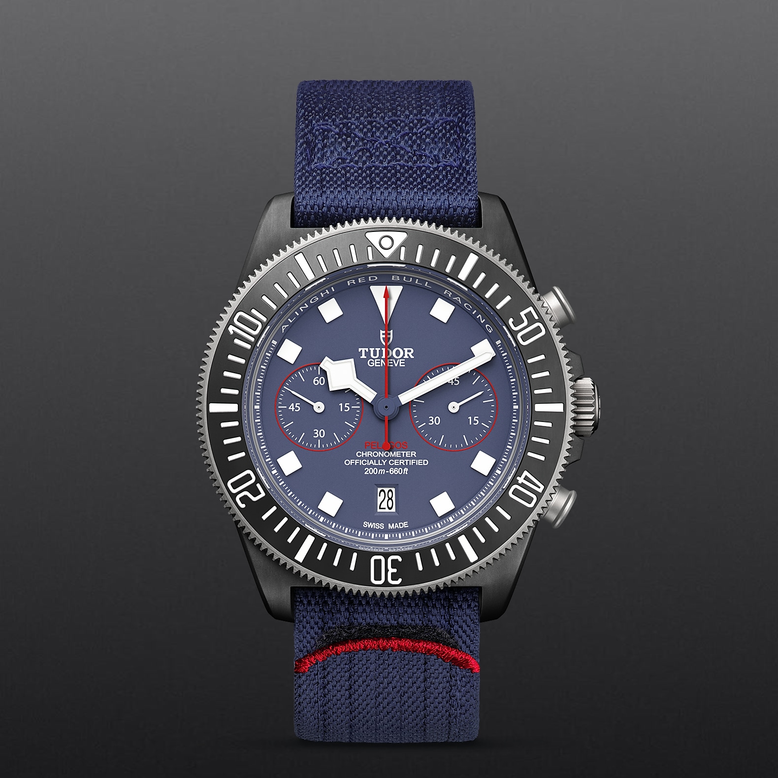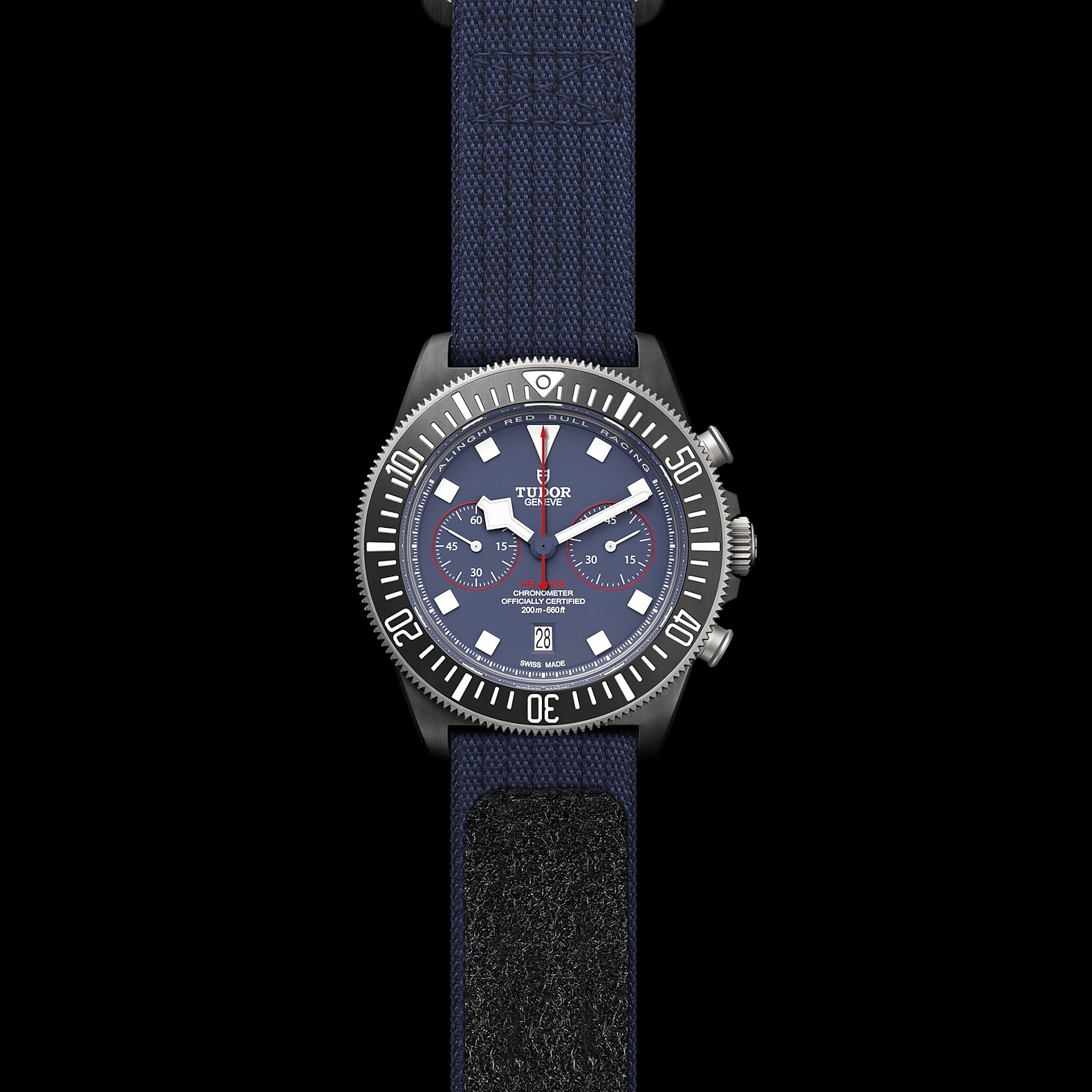 哑光蓝色,计时盘点缀红色装饰