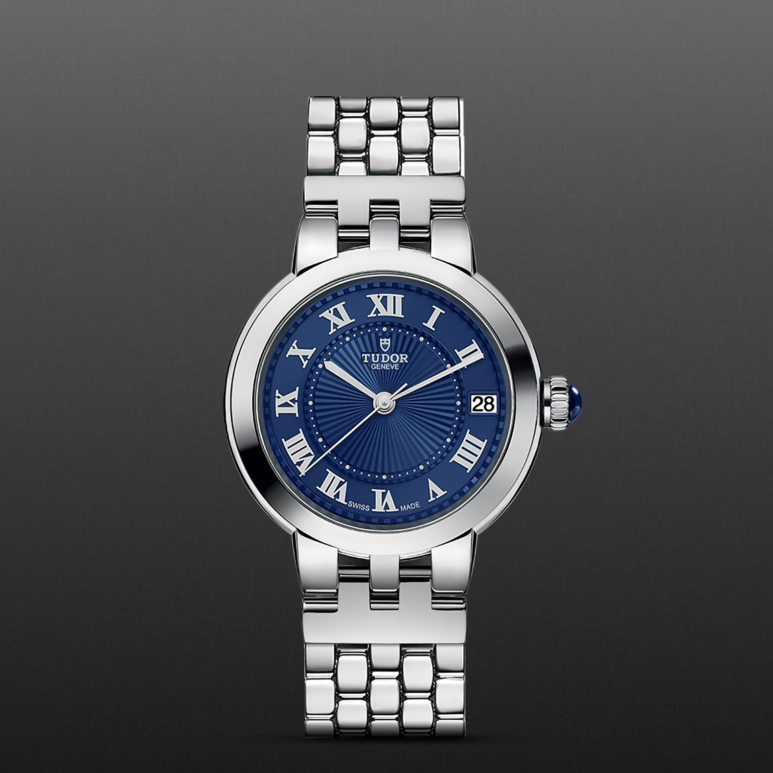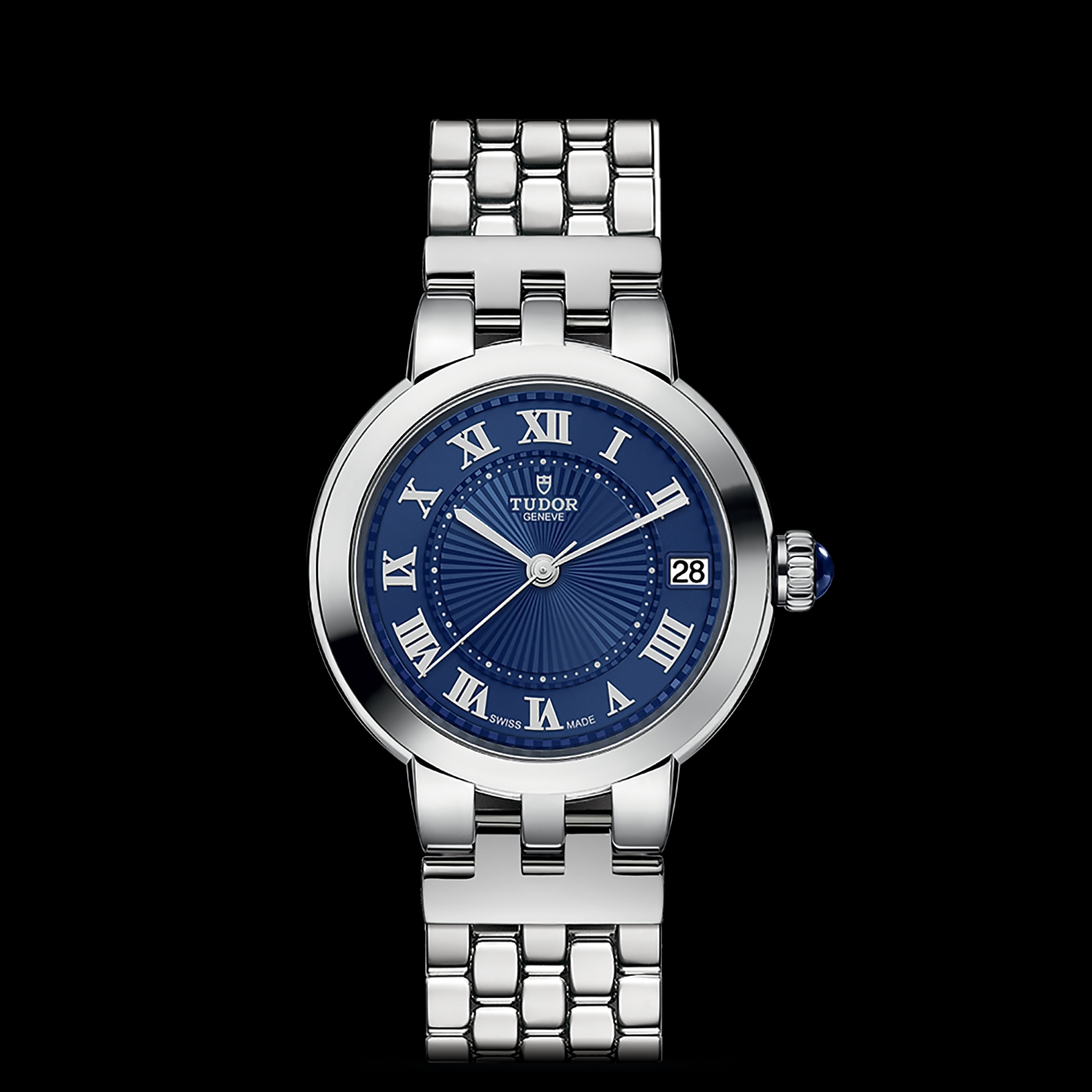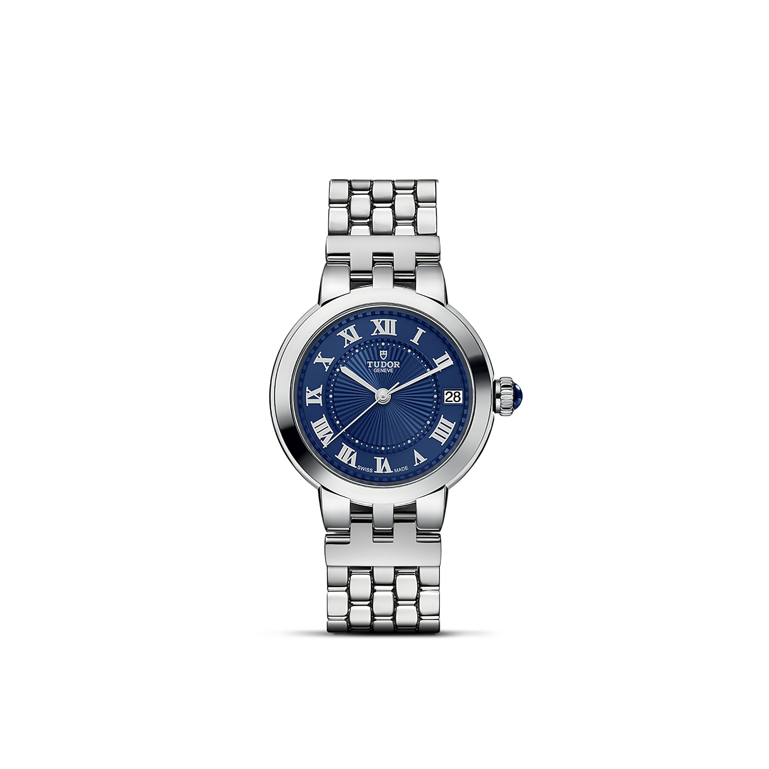 精钢旋入式上链表冠,饰以透明圆拱形蓝色尖晶石