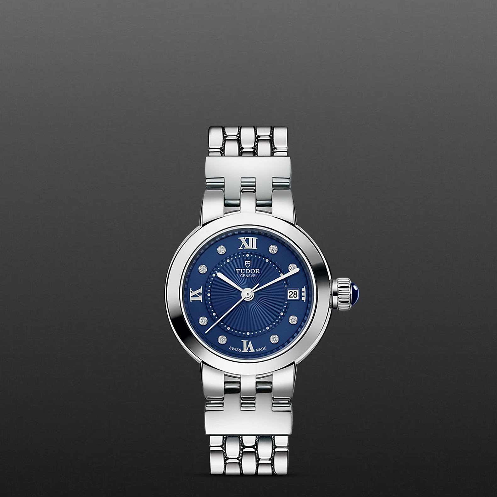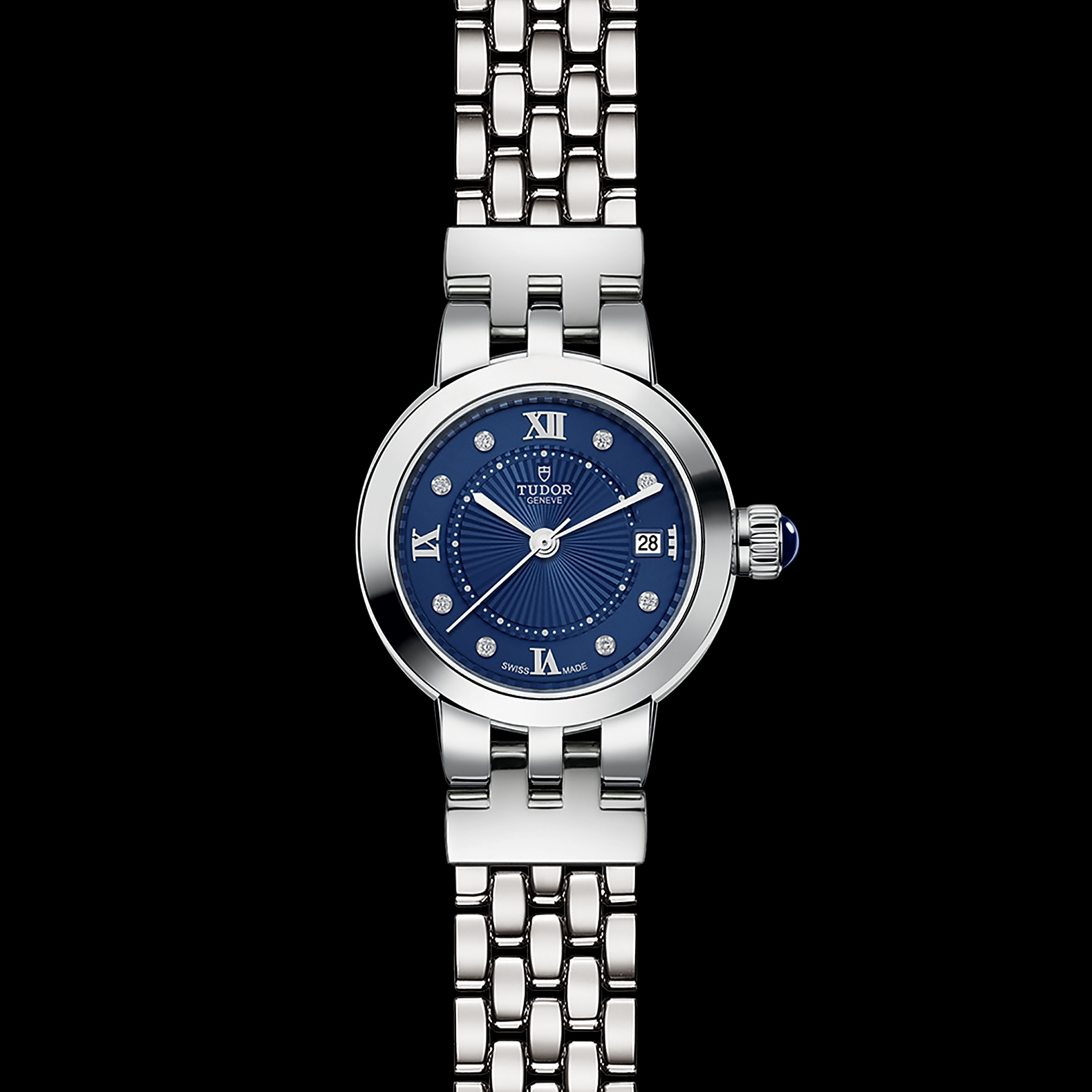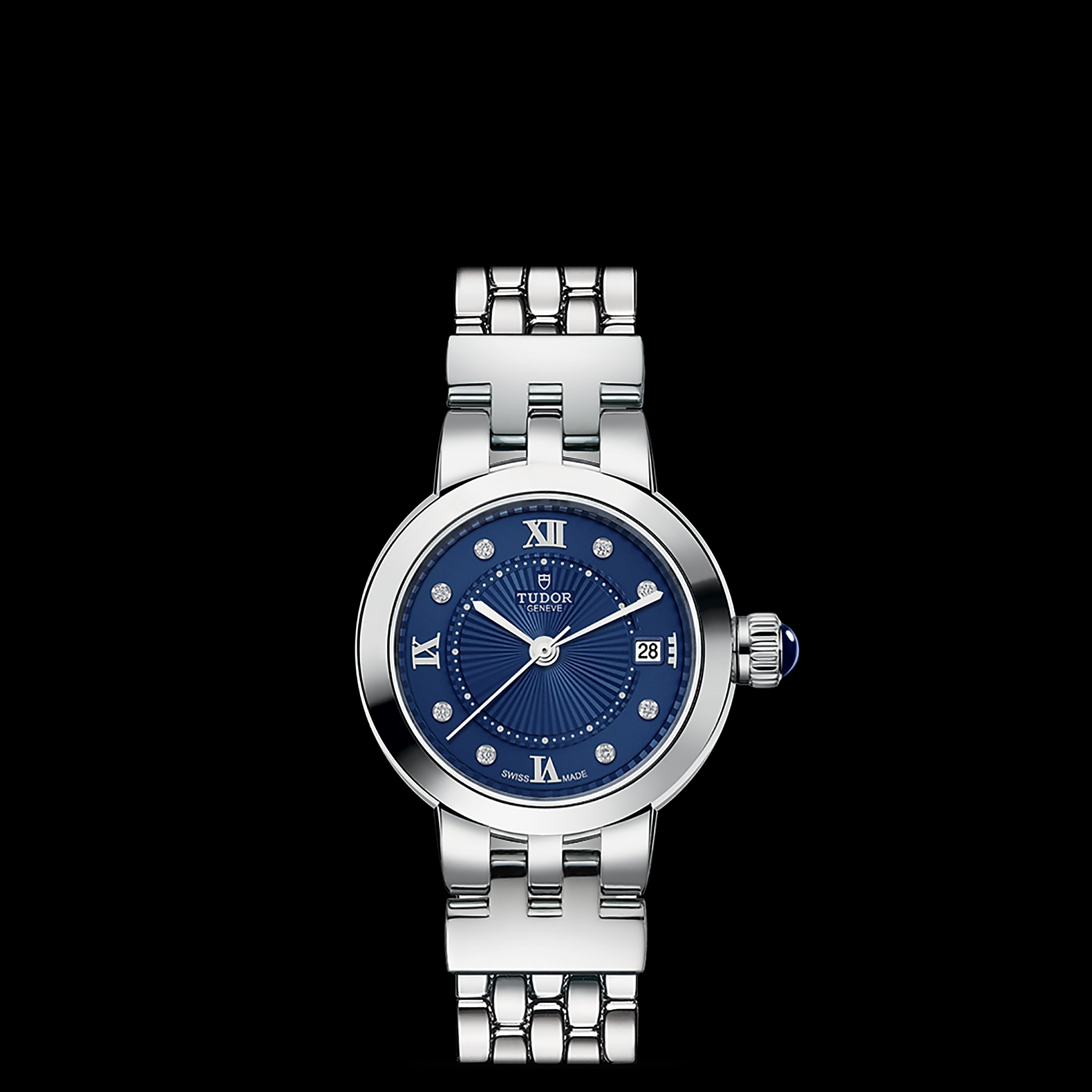 精钢旋入式上链表冠,饰以透明圆拱形蓝色尖晶石