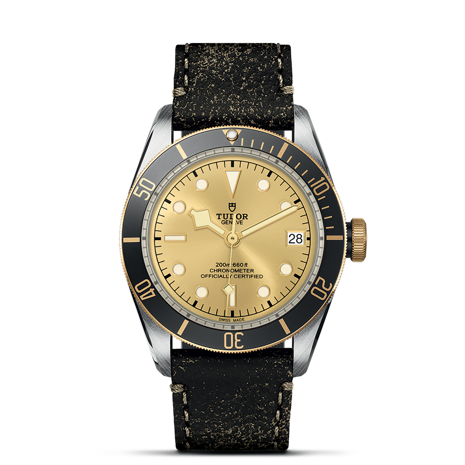 旋入式上链表冠,刻有帝舵表玫瑰标志,黑色漆面,配黑色阳极氧化铝上链表冠轴;精钢覆有0.3毫米黄金薄层