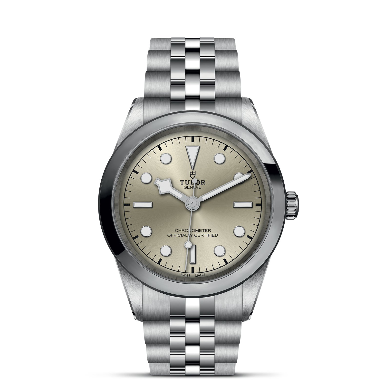 钢,大型款 ≥40毫米,不锈钢三链节表带,经磨光及磨砂处理,链节两侧光滑,配备帝舵表“T-fit”带扣