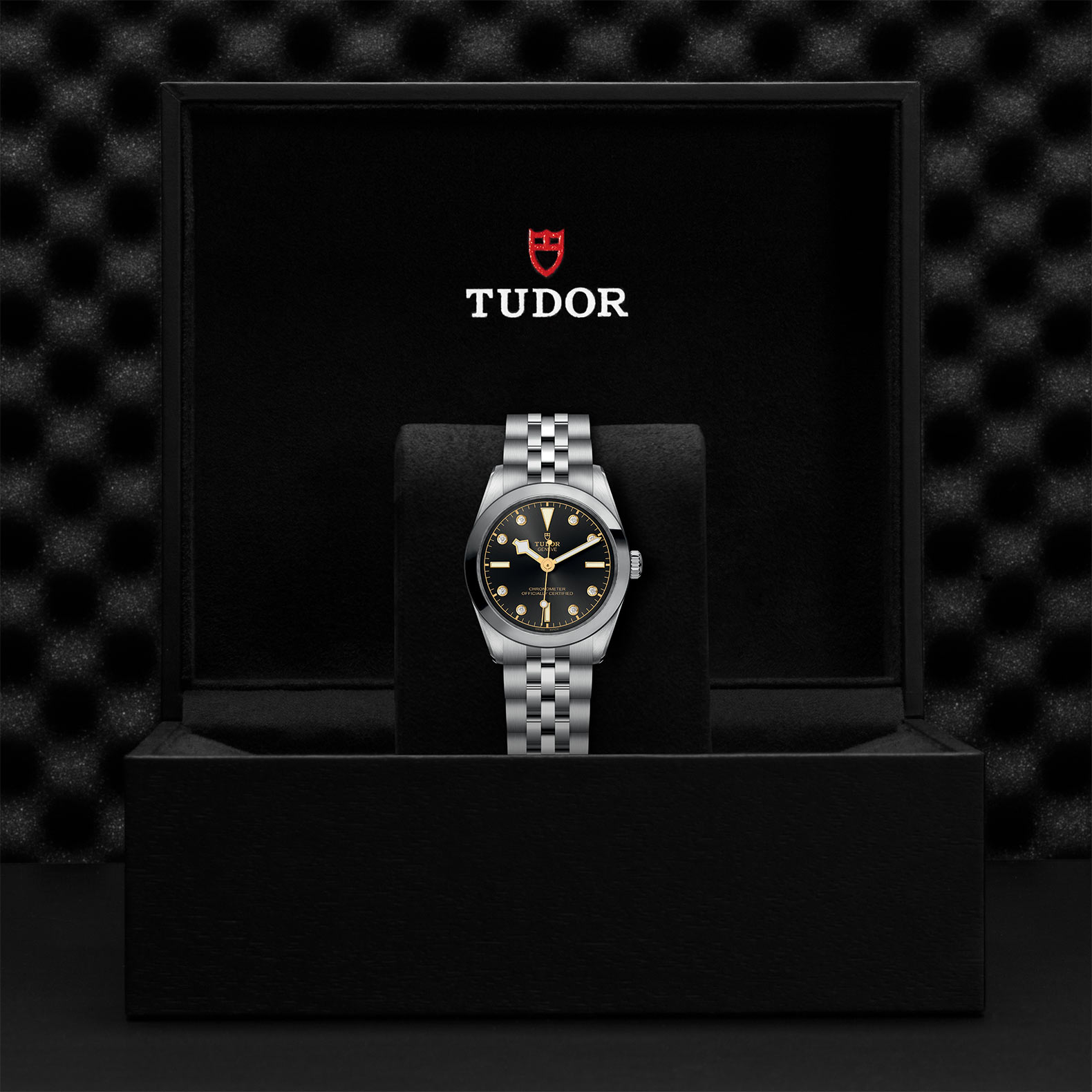 钢,大型款 ≥40毫米,不锈钢三链节表带,经磨光及磨砂处理,链节两侧光滑,配备帝舵表“T-fit”带扣