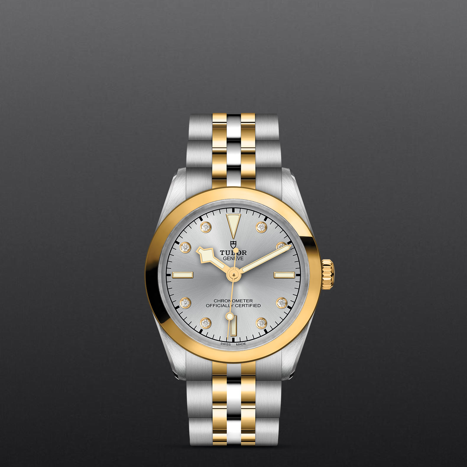 钢,大型款 ≥40毫米,不锈钢三链节表带,经磨光及磨砂处理,链节两侧光滑,配备帝舵表“T-fit”带扣