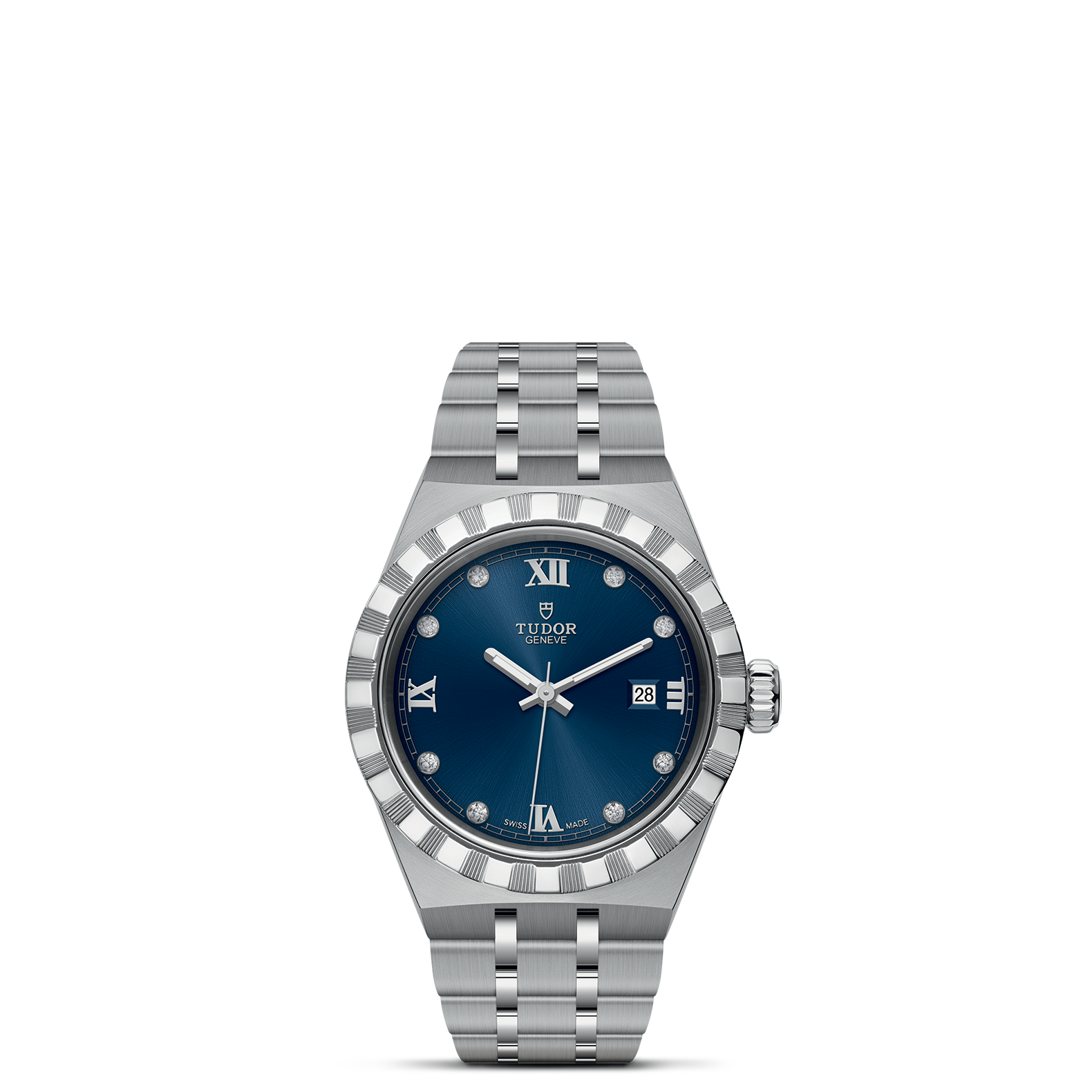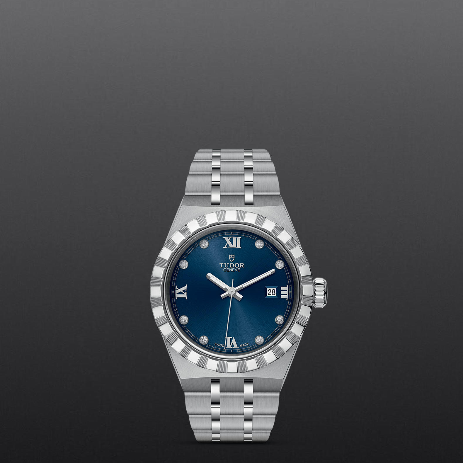 钢,大型款 ≥40毫米,不锈钢三链节表带,经磨光及磨砂处理,链节两侧光滑,配备帝舵表“T-fit”带扣