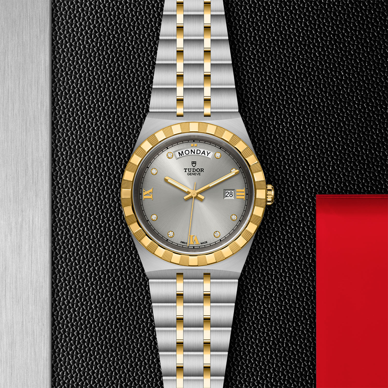 金及钢,大型款 ≥40毫米,首节中间链节由精钢或实心玫瑰金制成;其余中间链节由精钢或钢芯及0.2毫米玫瑰金包金制成