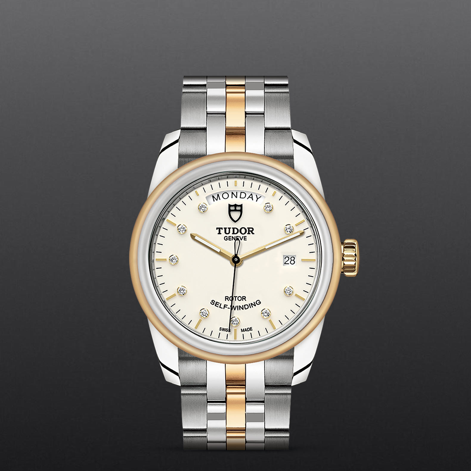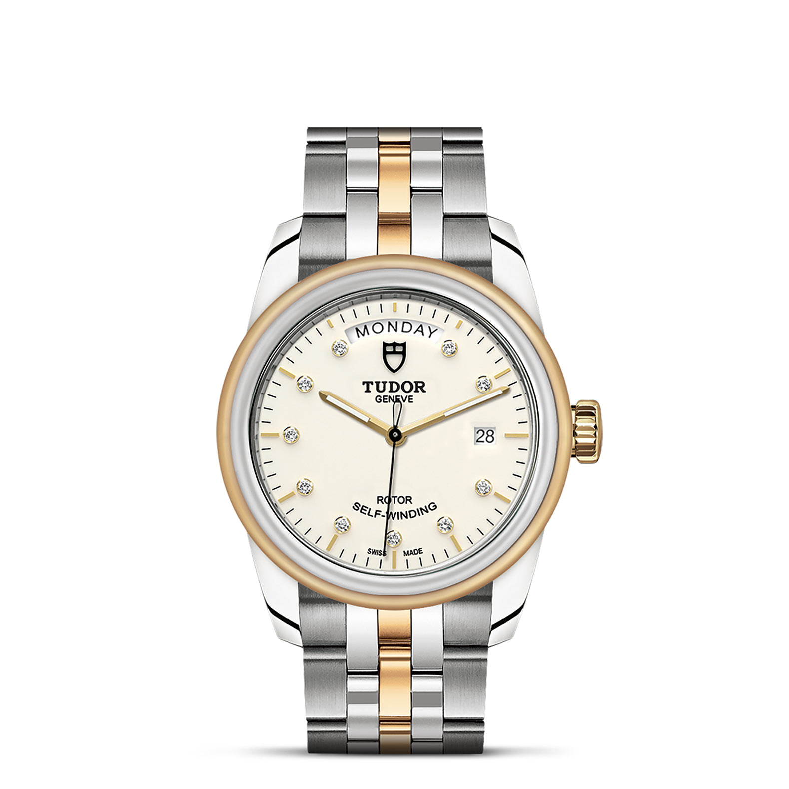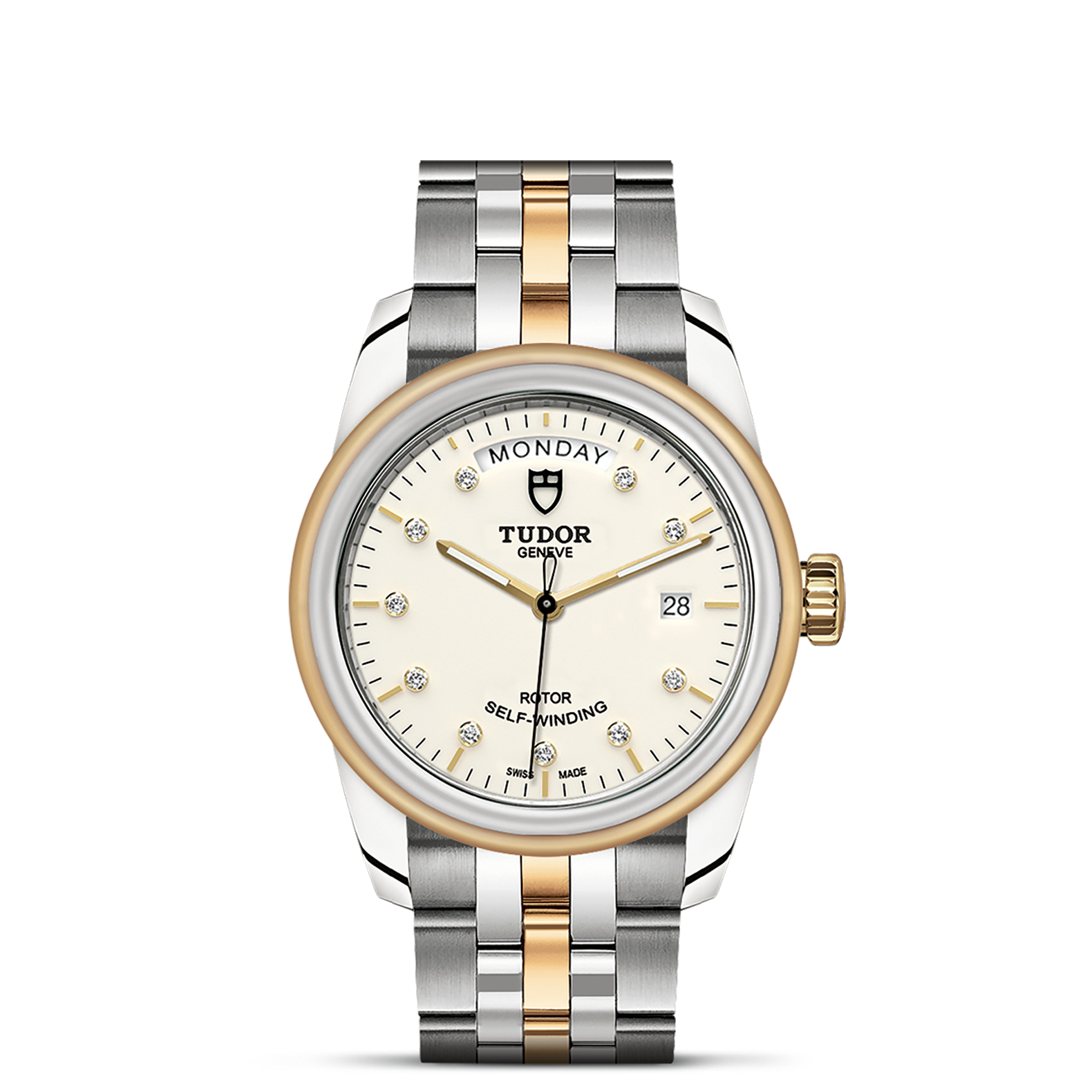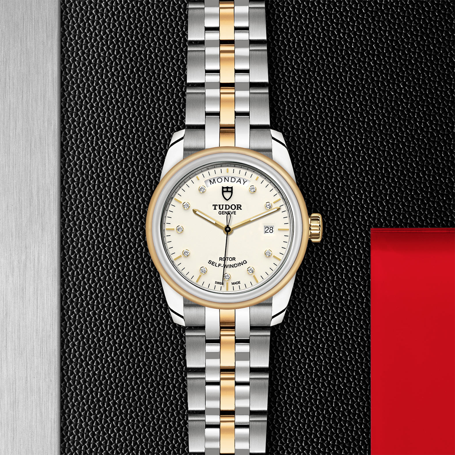 位于6点钟及12点钟位置的首节中间链节由实心黄金制成;其余中间链节由精钢或钢芯及0.2毫米黄金包金制成;摺扣及保险扣