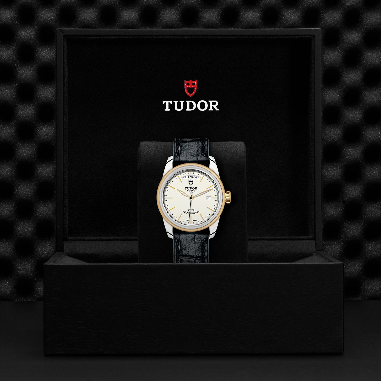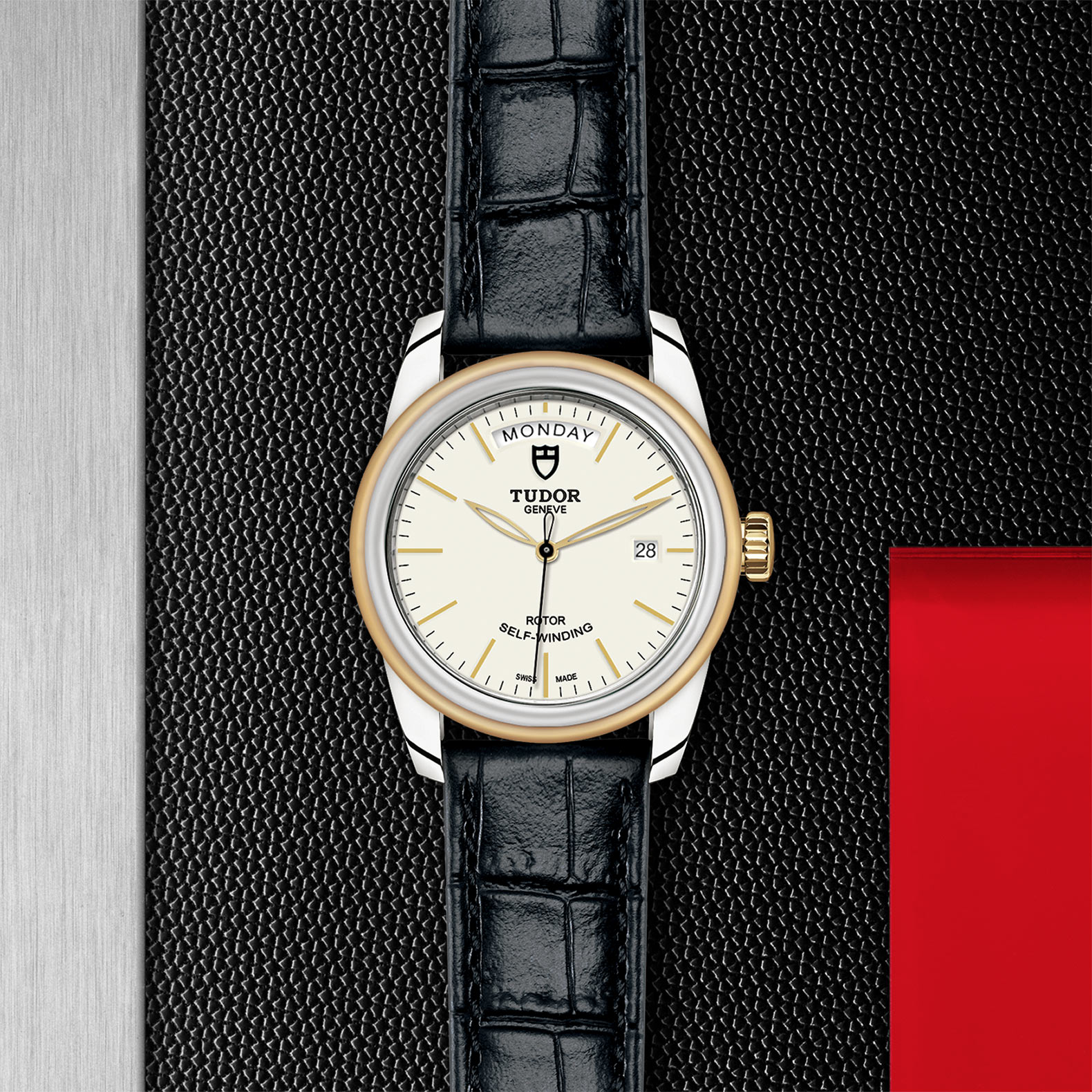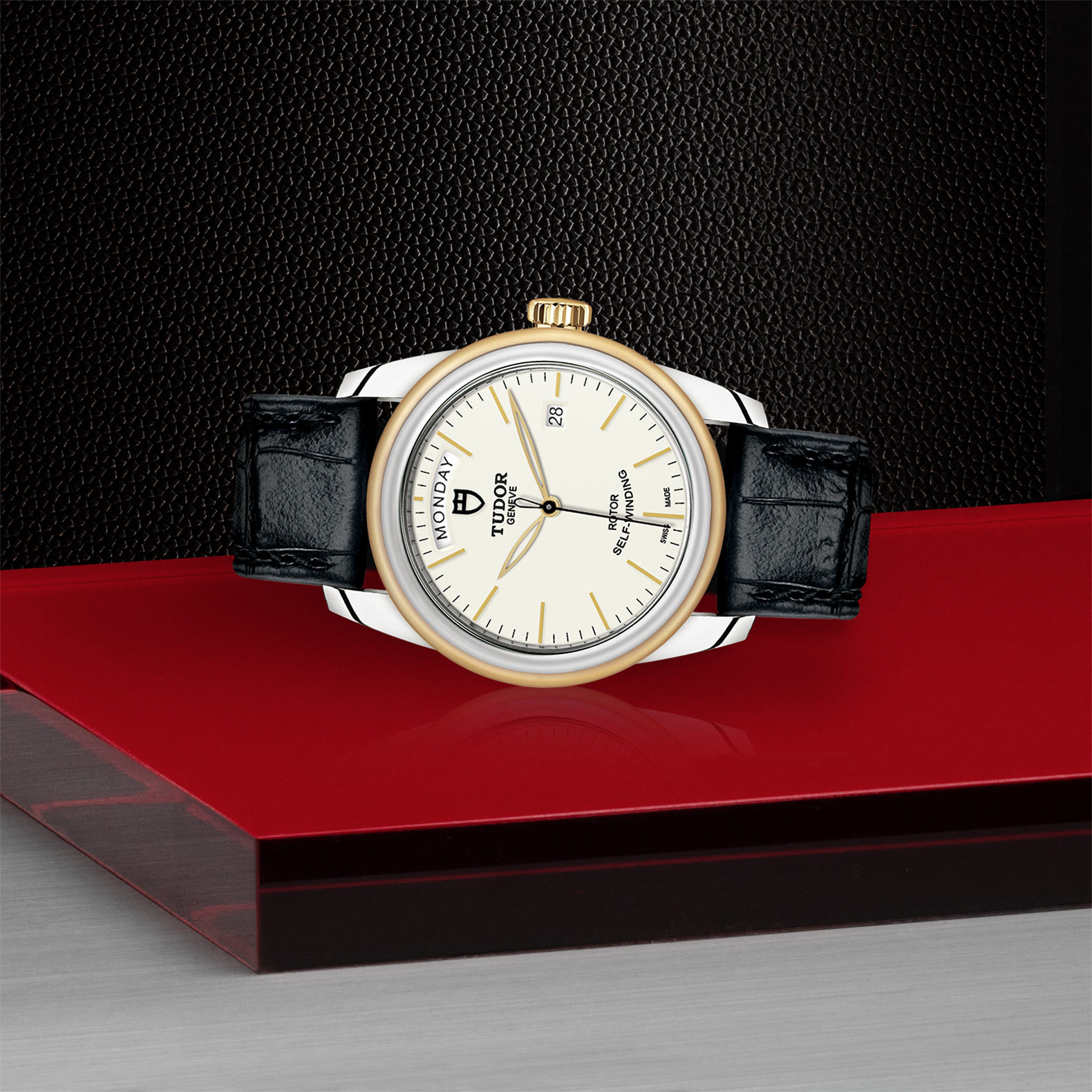 钢,大型款 ≥40毫米,不锈钢三链节表带,经磨光及磨砂处理,链节两侧光滑,配备帝舵表“T-fit”带扣