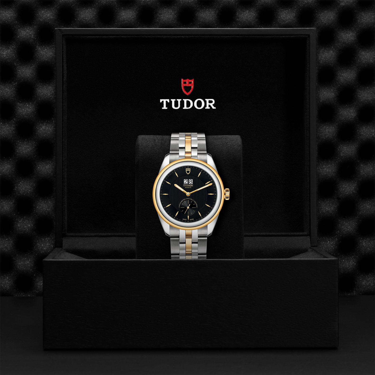 旋入式上链錶冠,饰以帝舵表标志;由钢芯及0.3毫米黄金包金制成