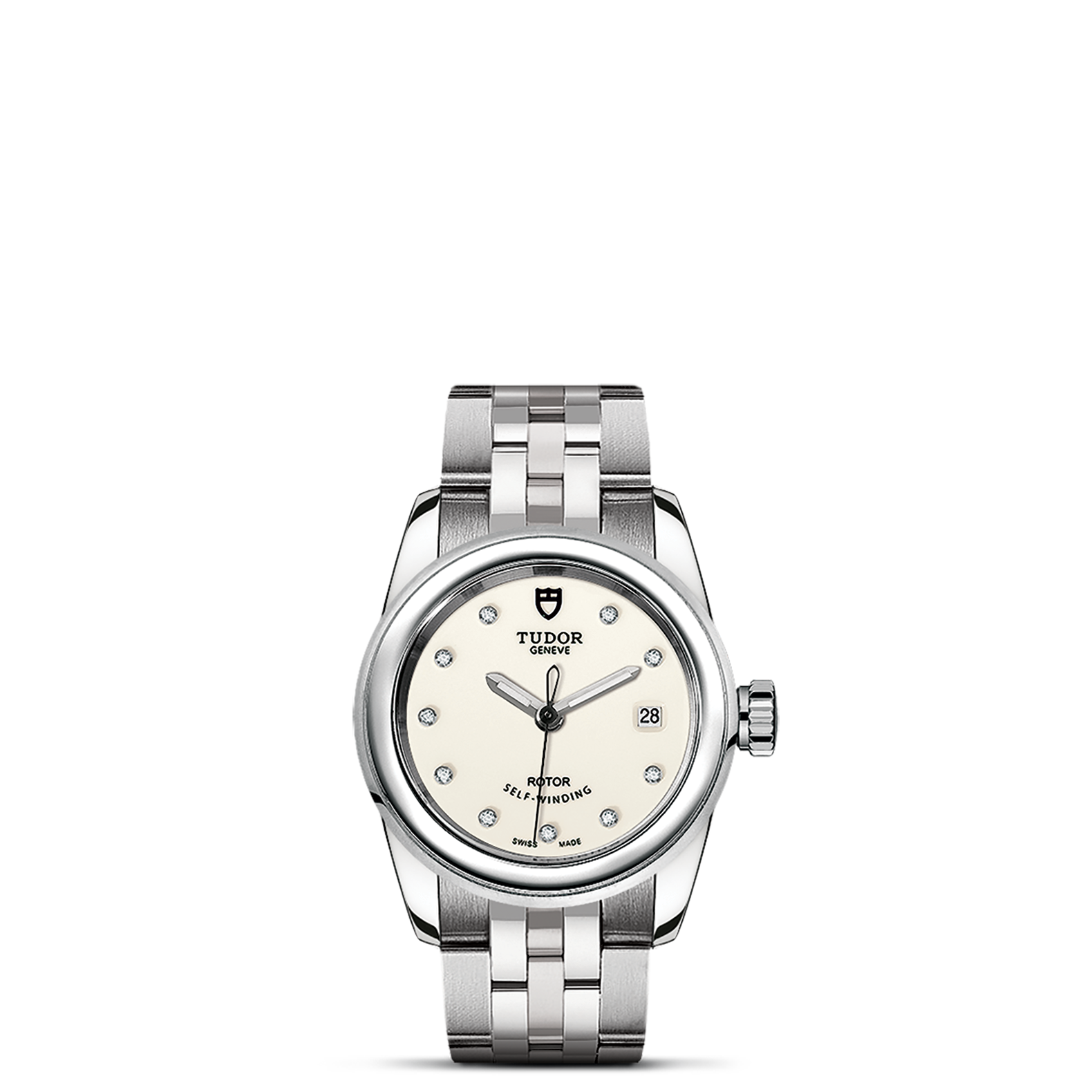钢,大型款 ≥40毫米,不锈钢三链节表带,经磨光及磨砂处理,链节两侧光滑,配备帝舵表“T-fit”带扣