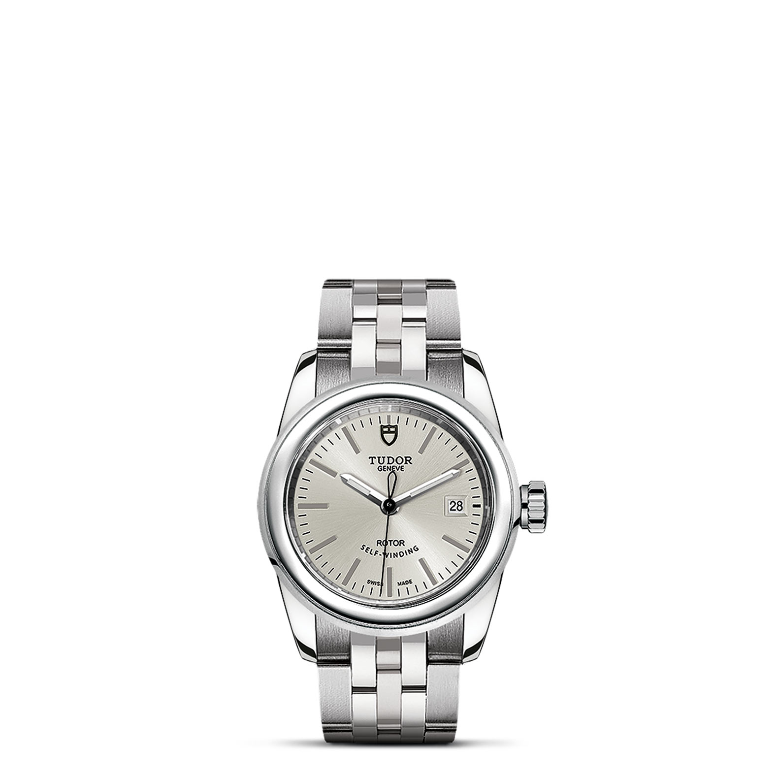钢,大型款 ≥40毫米,不锈钢三链节表带,经磨光及磨砂处理,链节两侧光滑,配备帝舵表“T-fit”带扣
