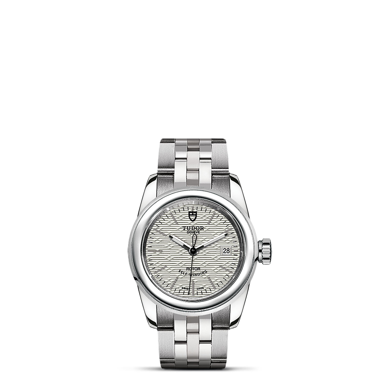 钢,大型款 ≥40毫米,不锈钢三链节表带,经磨光及磨砂处理,链节两侧光滑,配备帝舵表“T-fit”带扣