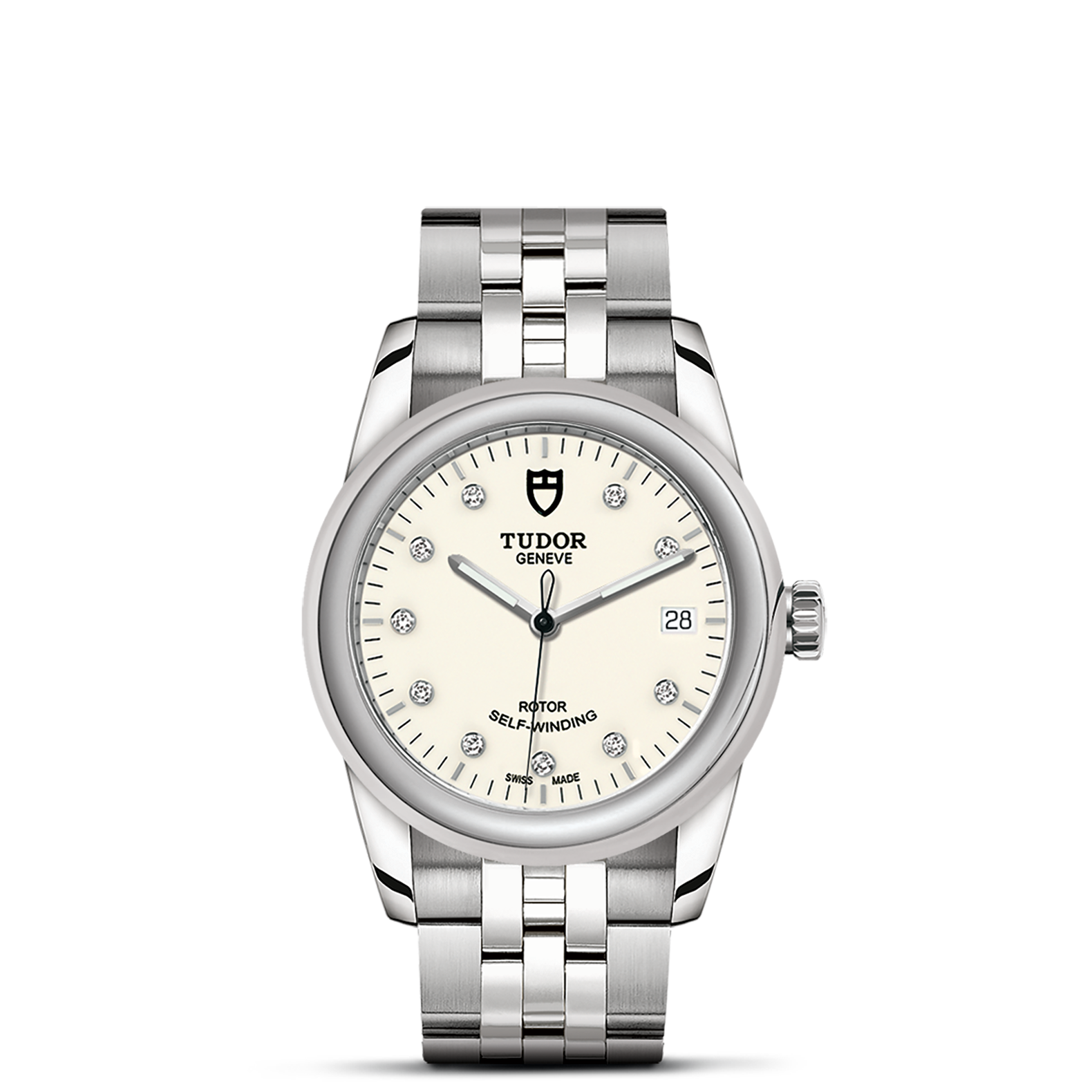 钢,中型款 35至39毫米,钢表带,7排链节,外侧链节表面磨砂,中间链节磨光,配摺扣及保险扣
