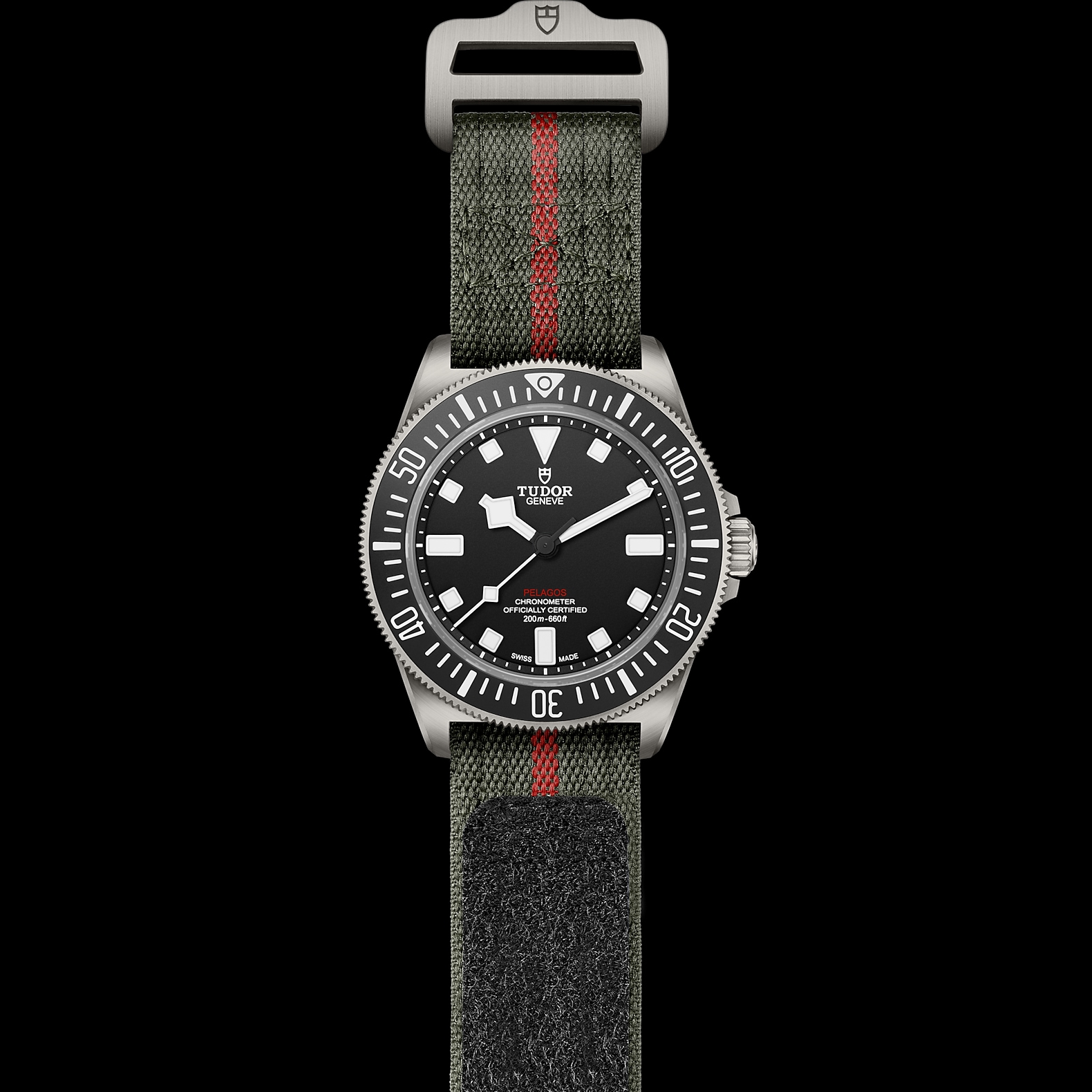 军绿色织纹表带,中央饰以红色条纹,配自黏式带扣