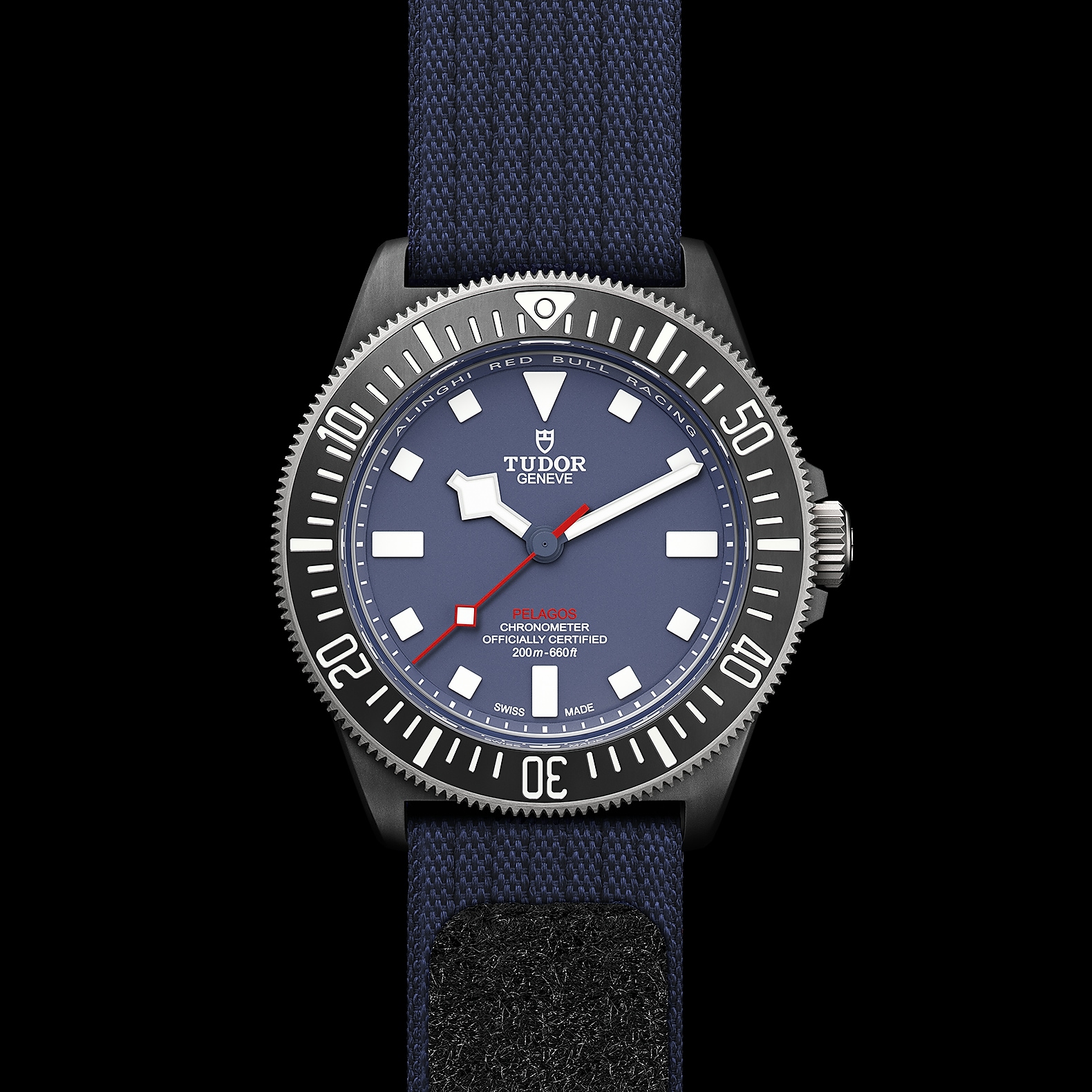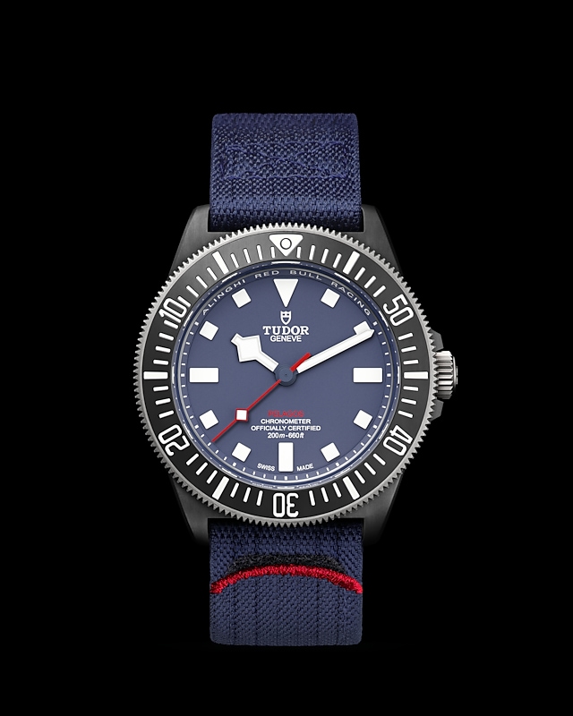 42毫米黑色碳复合材质表壳,哑光饰面,表壳底盖刻有阿灵基红牛帆船队标志